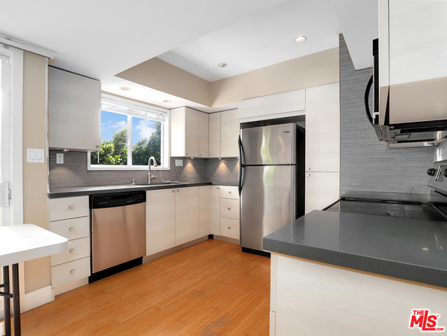 NEW YORK-STYLE CONDO IN PRIME SHERMAN OAKS :: This 1 BR / 1.5 BA upper end-unit has a coveted private walk-up entry that leads directly into the unit. Access down to the private 1-car garage is conveniently located right next to the unit. The light & bright, spacious open concept living space has a large picture window, high-ceilings, recessed lighting, built-in speakers, central A/C, in-unit laundry, 3 storage closets and gorgeous bamboo floors. The recently remodeled gourmet kitchen has stainless steel appliances, quartz countertops and a stylish tile backsplash. Enjoy the beautiful, lush greenery outside your bedroom window and dining area which also lends privacy to a covered balcony. The generous-sized Master Suite has lots of storage. The complex has secured entry, a pool, BBQ area and only 12 units which helps keep the HOA dues low.