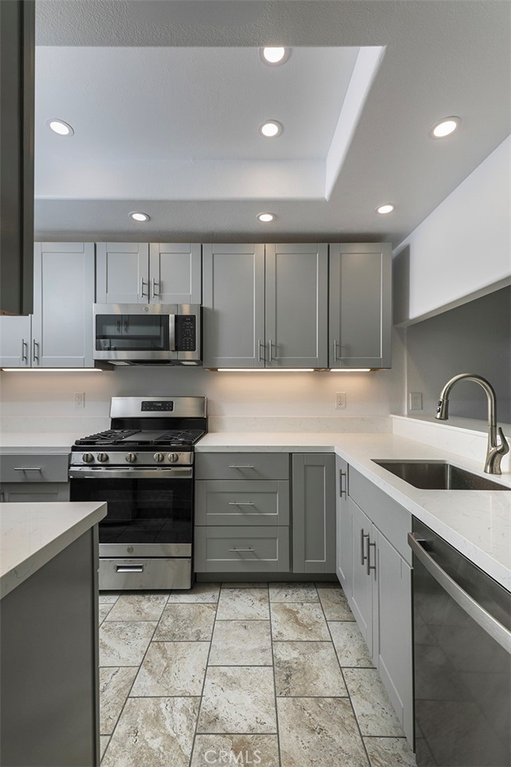 2BR, 2.5BA townhome with inside laundry, roof top patio, and many, many updates, in a 19 unit complex south of Ventura Boulevard, around the corner from some of the most chic restaurants and shoppes In Sherman Oaks. Not a flip, first time on the market! Updates include custom stone kitchen counters and breakfast bar, brand new kitchen appliances, custom cabinetry, recessed LED kitchen lighting, new flooring, new bathroom vanities, new AC unit, and more. Both amply sized BRs are en-suite, and there is a roof top patio for private outdoor gatherings. Fireplaces in LR and primary BR. Two parking spaces and your own private 10x10 storage room in the gated subterranean garage. The complex has a pool and exercise room, and competitive HOA dues that include EQ insurance. See it now while it's still available.