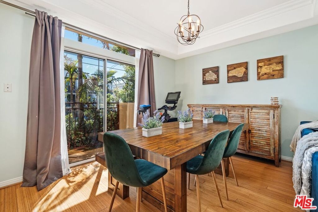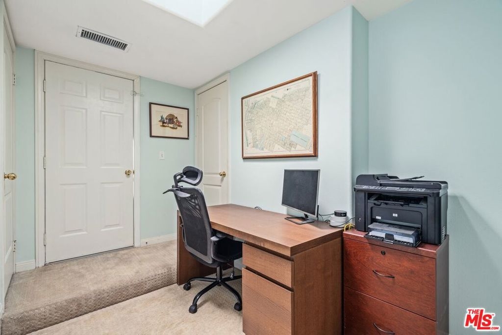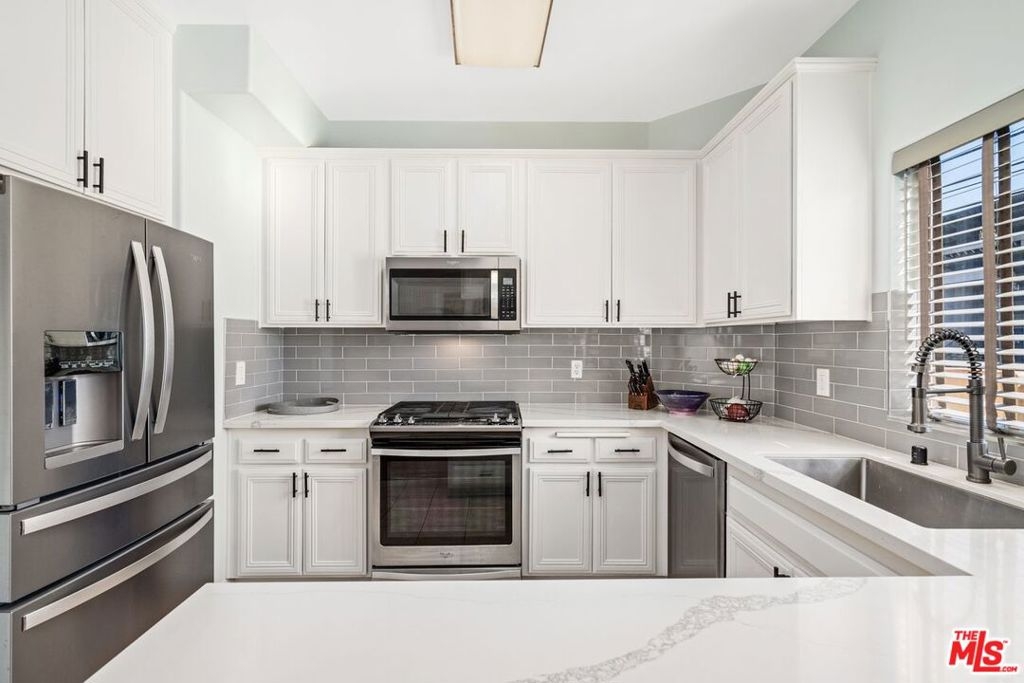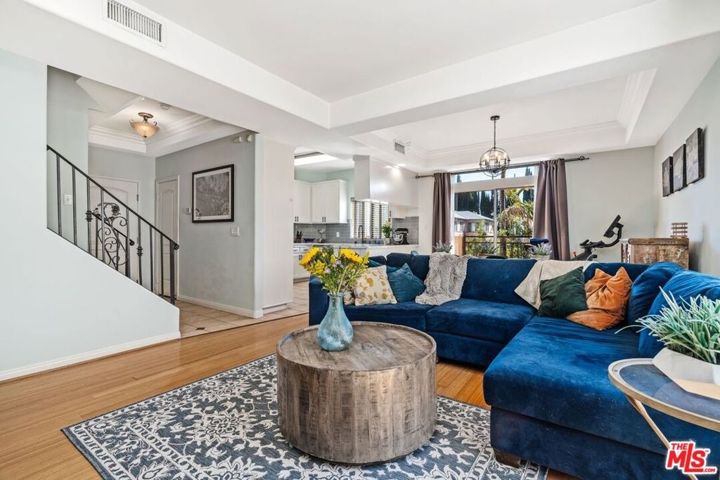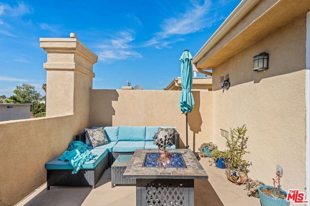 This front-end unit offers an open concept living room with bamboo wood flooring, high ceilings, crown molding and a gas fireplace. The open, beautifully updated kitchen has newer stainless steel appliances, quartz countertops and plenty of counter and cabinet space. The main floor also boasts a convenient half bathroom with a huge under-stairs closet for extra storage. The second level features the primary ensuite bedroom with a walk-in closet as well as an additional sliding door closet, dual sinks and lots of natural light. Adjacent to the primary bedroom is the second bedroom, a stacked laundry closet equipped with a newer washer-dryer and a full bathroom. The third floor features an open space, ideally suited for an office, as well as access to the private rooftop patio. Other conveniences include newer central heat and air conditioning unit, recessed lighting, a prewired home alarm system, lots of storage space, two balconies and only one common wall. The well maintained 13-unit Mediterranean style complex features a large heated spa, private grassy area, underground gated parking with side-by-side parking, low HOA dues, newer roof and earthquake insurance. This great location is close to freeways, Kester Elementary and a peaceful suburban neighborhood near multiple parks, Sepulveda Basin Wildlife Reserve and the Sherman Oaks Recreation center.