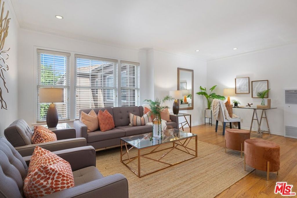 This well maintained mid-century complex harkens back to an earlier Los Angeles. Special features include a private single car garage, original crown moldings, chair rails, wood floors, recessed lighting, large living room, good sized bedrooms, a formal dining room, front and back entrance/exits, newer windows, back unit located on the second floor that looks south to the hills, well-kept complex, located one block from Ventura Boulevard, close to the 405 and 101 freeways, near the Westside, UCLA and Santa Monica Mountain hiking trails. This fabulous location is close to all amenities Sherman Oaks has to offer including a short walk to the nearby Whole Foods, Pavilions, restaurants and movie theaters. A Very Walkable score of 77.