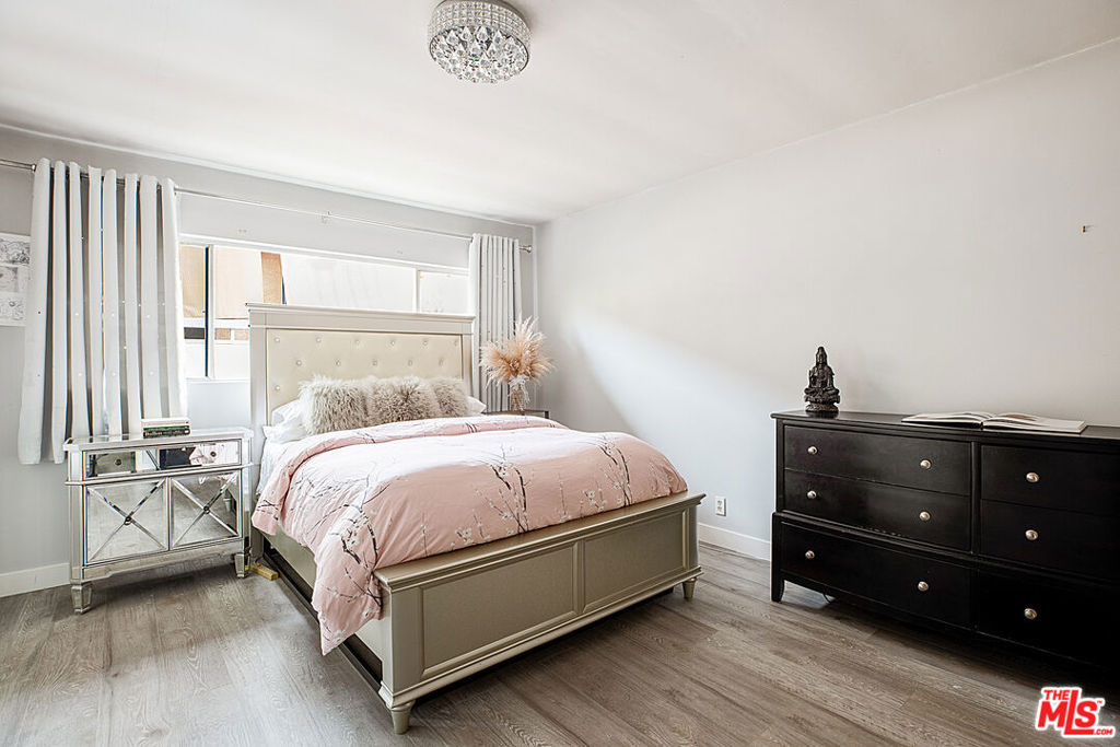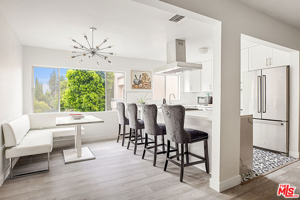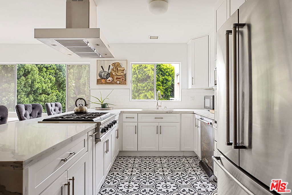 The ideal home for a chef or cooking enthusiast, this 2 bedroom top-level corner unit delivers a balance of classic design and modern finishes. Chef's-style, open kitchen boasts an abundance of natural light and updates, including Calacatta Creek quartz counter tops, cantilever serving bar, stainless steel GE "Monogram" gas range & Windster external-vented hood, a 48-bottle U-Line wine refrigerator, and porcelain patterned tile flooring. The open floor plan is the ideal space for cooking, dining and entertaining. In addition to the kitchen, current renovations include wide plank wood flooring, an updated full bathroom with floor-to-ceiling mosaic marble wall coverings, contemporary deep-soaking bathtub and lighting. Exclusive one-car garage. Location is walkable to to Ventura Boulevard, Sherman Oaks Galleria, Burke Williams Spa, Whole Foods Market, retail, dining and services. OFFER DEADLINE: 9/1/2021 AT 12:00 Noon.