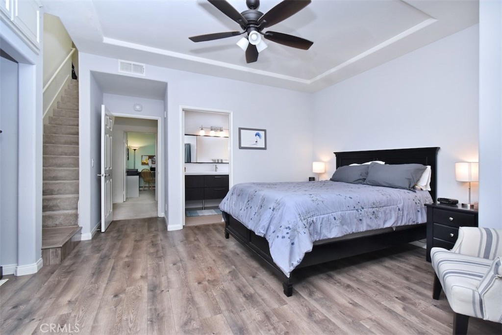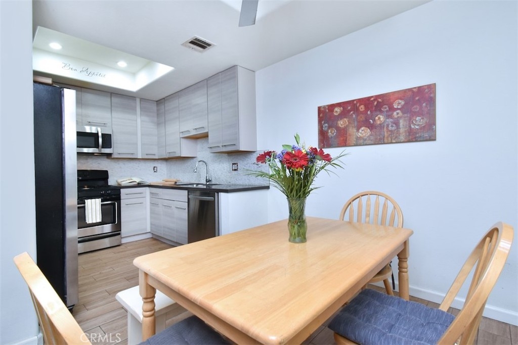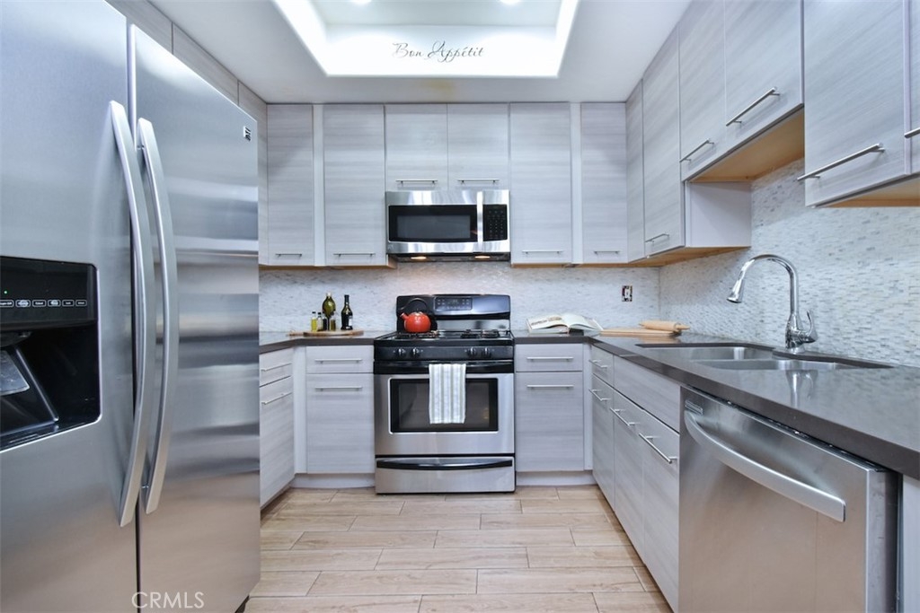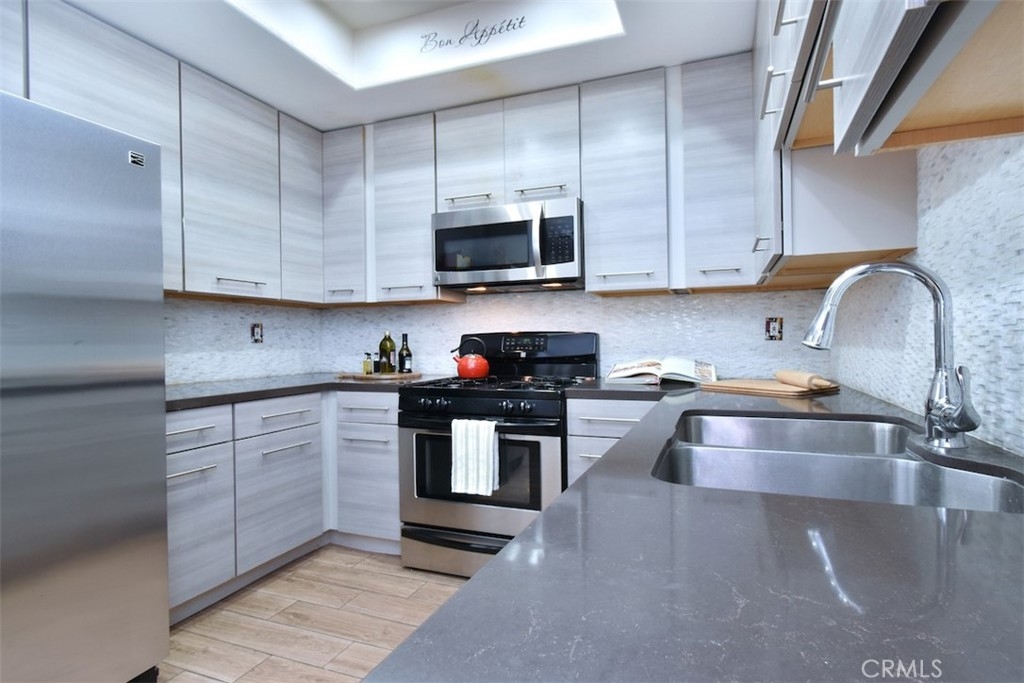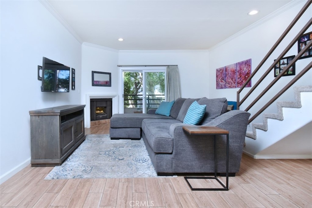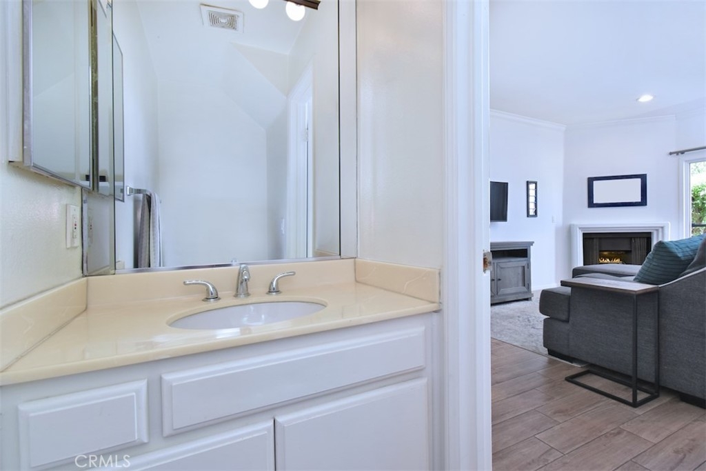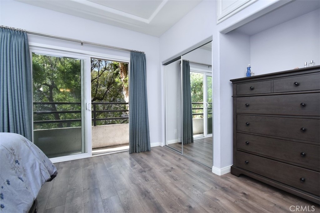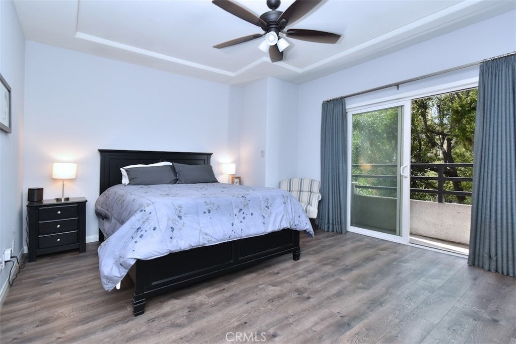 Welcome home to this pristinely maintained, townhome style condo, featuring two outdoor balconies, a private rooftop deck and side by side parking! Enter into a light and bright living room with a cozy gas fireplace, recessed lighting, elegant crown molding and direct access to a long, west facing balcony. The remodeled kitchen features stainless steel appliances as well as modern quartz countertops, sleek cabinetry and hardware, and gorgeous tiled backsplash. Adjacent to the kitchen is a spacious dining area with a stylish ceiling fan and lots of natural light from the nearby window. There is good sized half bathroom that is conveniently located downstairs as well. Upstairs features two bedrooms, each with their own en suite, remodeled bathroom. The bedroom on the left boasts a walk in closet, and the primary bedroom on the right features a ceiling fan and direct access to the second, upstairs balcony. Also accessible through this bedroom is the private and spacious rooftop patio, which is incredibly rare and perfect for entertaining or enjoying some peaceful time alone. Other impressive upgrades include new double paned windows and slider doors, custom upscale drapery, new blinds, and a Nest brand thermostat and smoke detectors, Two assigned side by side parking spaces, as well as guest parking in the garage. The well maintained complex has a pleasant and spacious interior patio and planter area, and features earthquake insurance and security cameras throughout. Located within walking distance to a myriad of coffee shops, restaurants and bars, this turn key home is truly the epitome of the classy and convenient Sherman Oaks lifestyle!