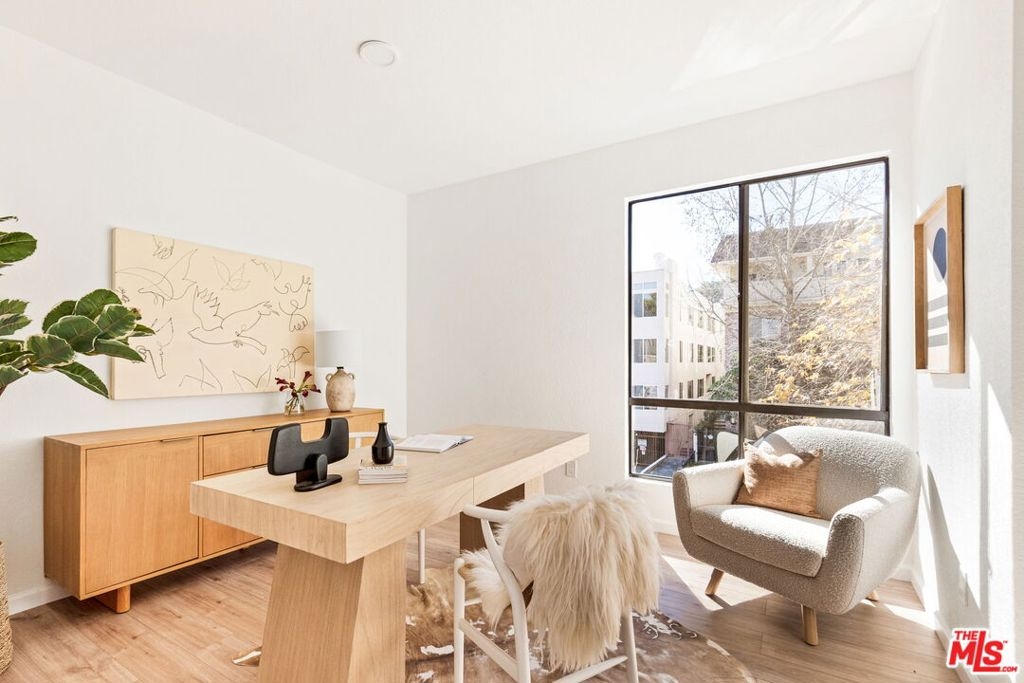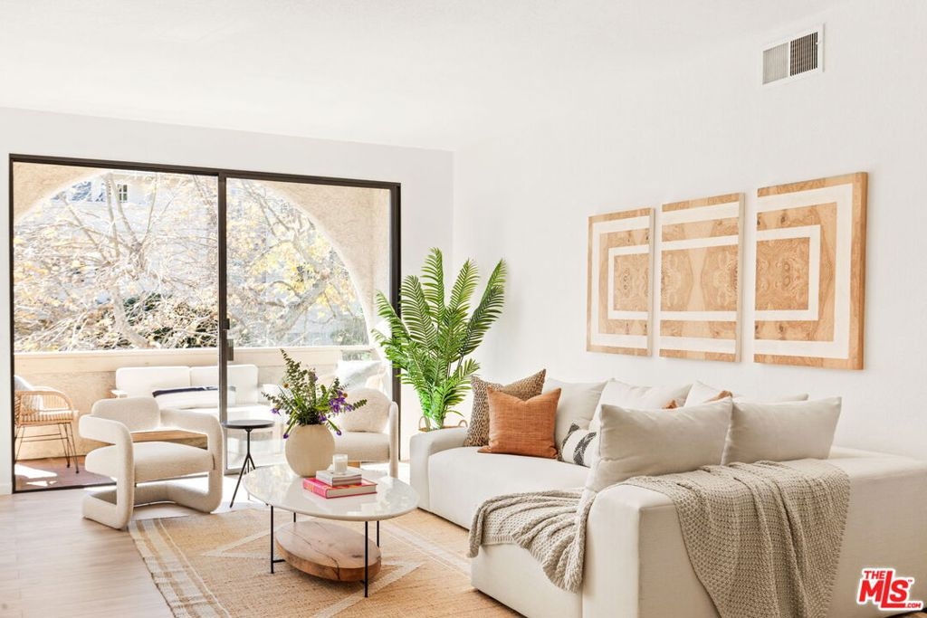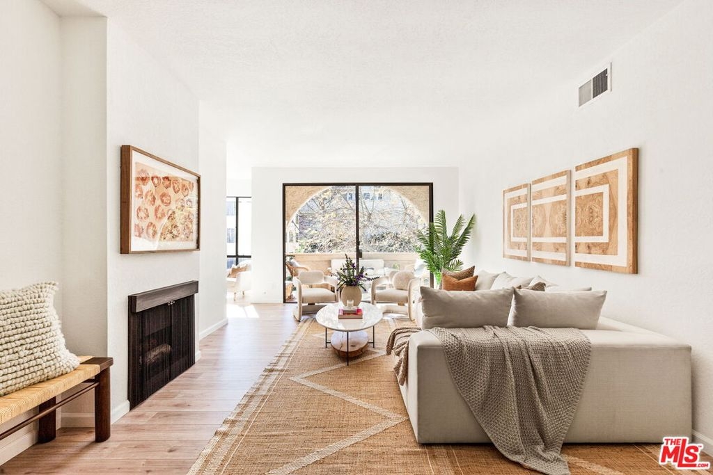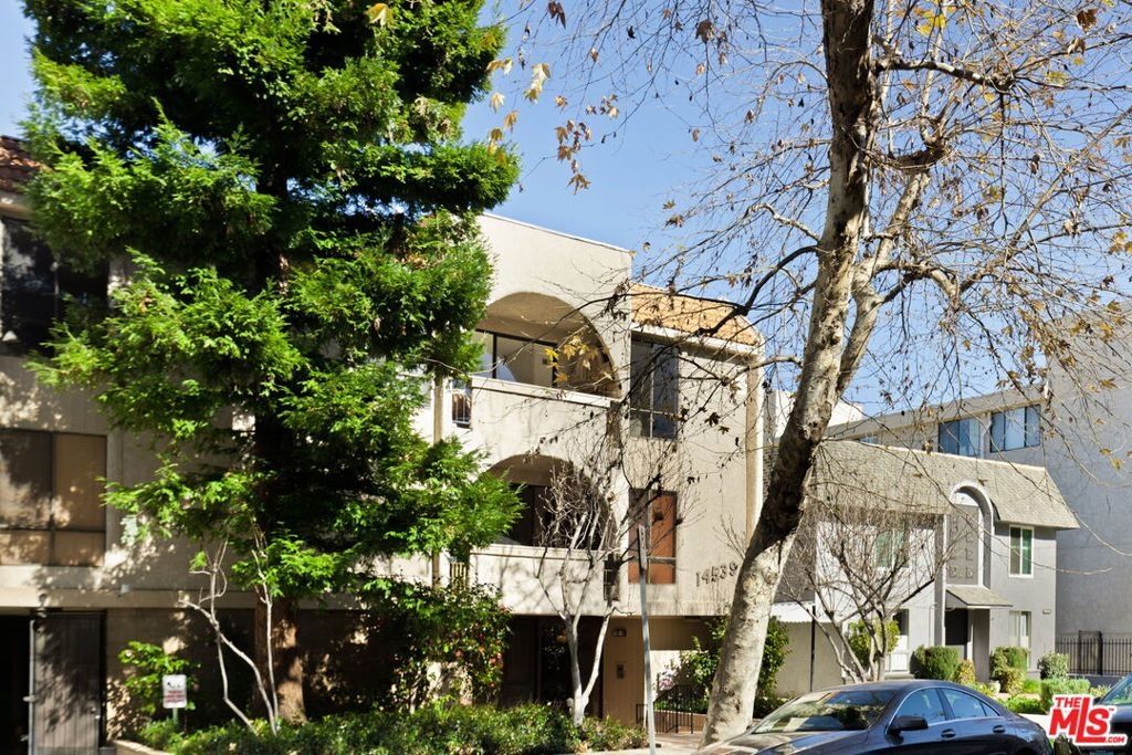 On a tree-lined street in the heart of Sherman Oaks, this light-filled top floor unit checks all of the boxes. Through tall double doors, enter into the high-ceilinged, spacious formal living room, featuring a decorative fireplace and large sliding glass doors that lead to a private balcony. From the living room, flow seamlessly into the kitchen and dining room, as well as into the den/office with a big south-facing picture window. Down the hallway, pass an ample laundry room with additional storage and find two generous bedrooms, one with an ensuite bath, with newly installed vanities. Two side-by-side parking spaces are included with the unit. Located in a coveted pocket south of Ventura Boulevard, and just a stone's throw from shops and restaurants, easily access UCLA, the Sportsman's Lodge, studios, and all the Valley has to offer. Hurry!