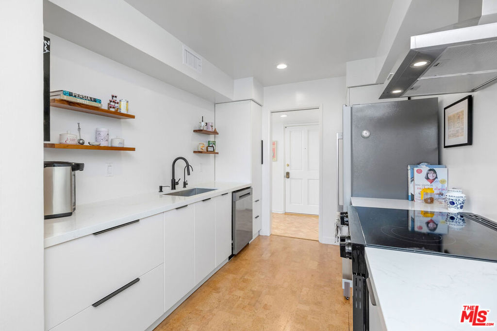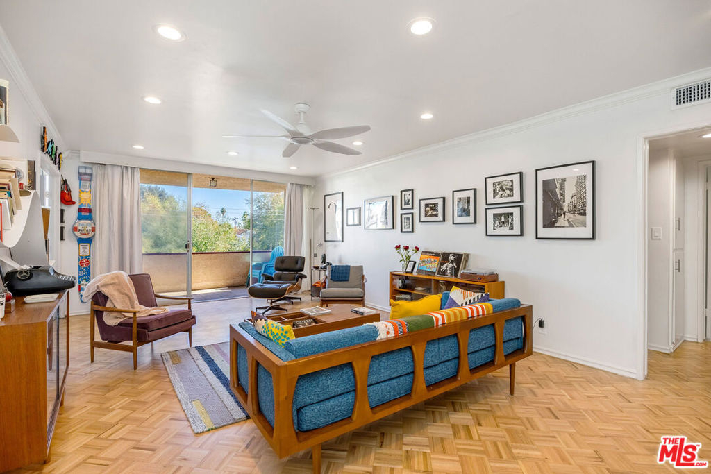 This modern, move-in-ready 1BR/1BA condo in the heart of Sherman Oaks blends chic Upper West Side character with mid-century minimalism. Wall-to-wall bookshelves are the cosmopolitan anchor for an open living area, enriched by refinished parquet floors and a private balcony view of the Sherman Oaks hills. Double French doors lead to a recently remodeled kitchen complete with quartz countertops, eco-friendly cork flooring, stainless-steel appliances, and an adjoining dining area/flex space ideal for a home office or lounge.The spacious bedroom mirrors the unit's generous scale, offering a quiet top-floor retreat just moments from neighborhood hot spots like Casita, Taisho, BLVD Steak, Whole Foods, Ralphs, and CorePower Yoga. Thoughtful upgrades throughout include new HVAC, a newly renovated bath with Electrolux stackable W/D, designer ceiling fans, and contemporary finishes. Located in an HOA community with a classic kidney-shaped pool, the unit also includes a dedicated parking space with storage. Style, soul, and comfort meet seamlessly in this elegant Sherman Oaks flat.