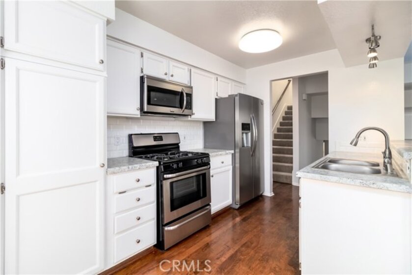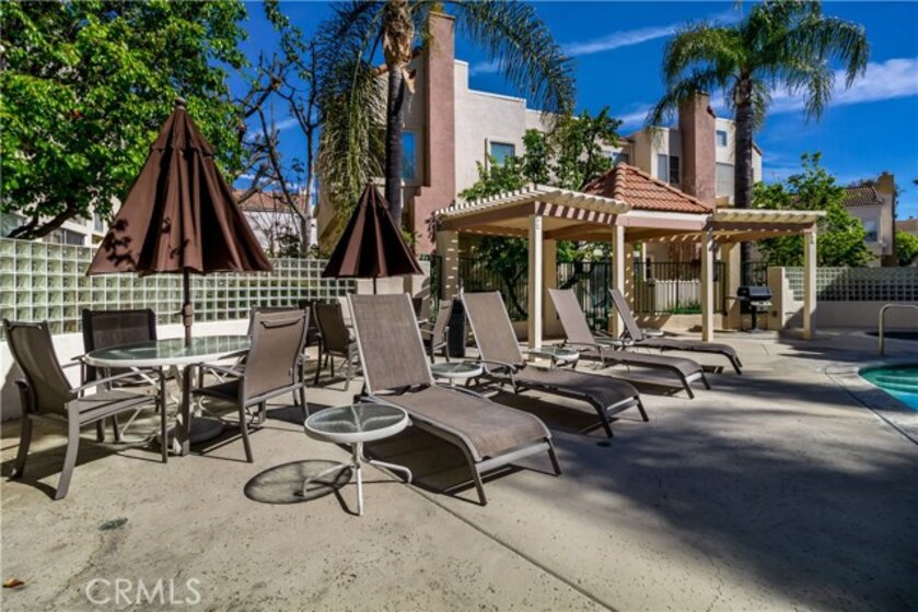 Upscale and urban, this bright and airy, 3 bed, 2.5 bath, tri-level townhome with attached 2-car garage is in the highly desirable gated community of Chandler Park Village. This home features an open floorplan living space with high ceilings, wood laminate floor, and ample light. Ground floor living room has vaulted ceiling, cozy fireplace, and sliding glass door access to a charming patio/garden. The kitchen and dining area is a half-story up and features ample cabinet storage, marble style counters, breakfast nook and bar, and sliding glass door access to a terrace perfect for dining al fresco. Second floor Master suite has vaulted ceiling, sizable mirrored door closet and en-suite bath. Two further good-sized bedrooms are on the third floor and share a skylight hallway and bath with both sink and vanity. Double, attached garage offers direct access and laundry area. Community features include resort style pools, hot tubs, barbecues, and lounging areas with mature greenery. Centrally located near the 405 and 101 freeways, grocery store, shops, dining, and public transportation. HOA dues include water.