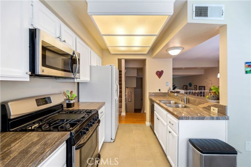 Highly desirable 3 bed, 2.5 bath tri-level, corner unit townhome in the gated community of Chandler Park Village. Open and modern floorplan with vaulted ceilings, an abundance of natural light, and a fireplace in living room. Powder room off living room. The second level overlooks the living room and has a spacious dining and kitchen area with a private balcony.. Updated kitchen with new flooring, beautiful granite countertops and crisp white cabinets. Enter patio from dining room or kitchen. Large master bedroom on the third level has vaulted ceilings and a wall of closet and updated master bath. Two sizeable guest bedrooms share a full bath that has been updated. Community features include resort style pools, hot tubs, barbecues, and lounging areas with mature greenery. HOA dues include water, trash, sewer and security. Complex does have Earthquake Insurance. Centrally located near the 405 and 101 freeways and public transportation. 2 car attached garage with direct access allows for convenient access to parking, additional storage, and washer/dryer. Ample guest parking. This is truly a gem!