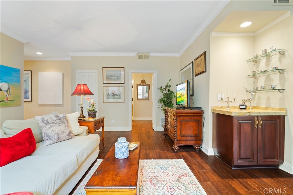 Beautiful Single Level, Corner Condo located in Prime Sherman Oaks. This stunning 2 bedroom/2 bath plus Den unit boasts slightly under $1,300 sq.ft. Entertaining is seamless with a bonus Den which can easily serve as a 3rd bedroom. Living Room with fireplace and French Doors that lead out to a private patio. The Gourmet Kitchen includes a designer backsplash, Granite Countertops and a Breakfast Bar overlooking the Formal Dining Room. The Master Suite includes a walk-in Closet and Coffered Ceiling and Master Bath. The second bedroom has mirrored closet doors. Additionally, the Condo includes a full size stackable laundry. Completely remodeled with gorgeous crown moulding and rich engineered dark hardwood floors throughout. Minutes away from Ventura Blvd, 101 Frwy and Restaurants and World Class Shopping!