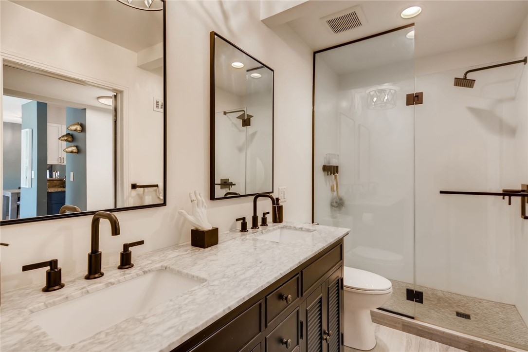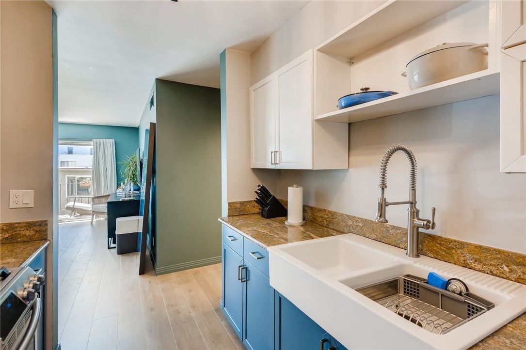 Stylishly remodeled 1 bd / 1 ba condo with a balcony and open layout in desirable Sherman Oaks! Situated in Citywood Condominiums, a 4-story elevator building, you’ll have access to community amenities and one gated garage parking spot. The unit is flooded with natural light, beaming through the new sound-resistant windows and sliding glass doors and reflecting off the maple wood floors. Easily entertain between the living and dining rooms, which boast a custom paint scheme and access to the kitchen, equipped with granite countertops, stainless steel appliances, two-tone shaker style cabinetry, a farmhouse sink, pantry, and bar pass-through with seating. Wind down in the bedroom that contains a walk-in closet, and enjoy the spa-like bath, complete with a dual sink marble vanity, matte black fixtures, and a glass enclosed walk-in shower with a rain head. The unit also has a huge closet off the foyer that could be used as an office or storage space. Other features: Central A/C and Forced Air heating (updated 3 years ago); Smart thermostat and locks. Community amenities: Pool; Spa; Gym (under renovation). HOA covers building maintenance/renovations, water, and sewer. Buyer should verify all information.