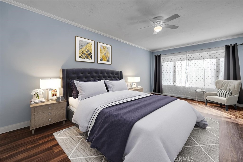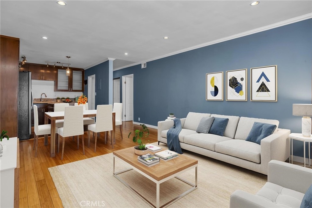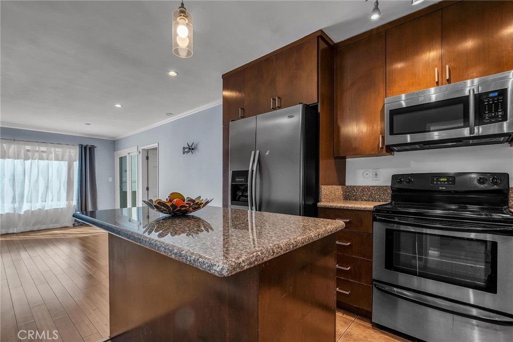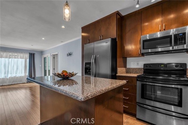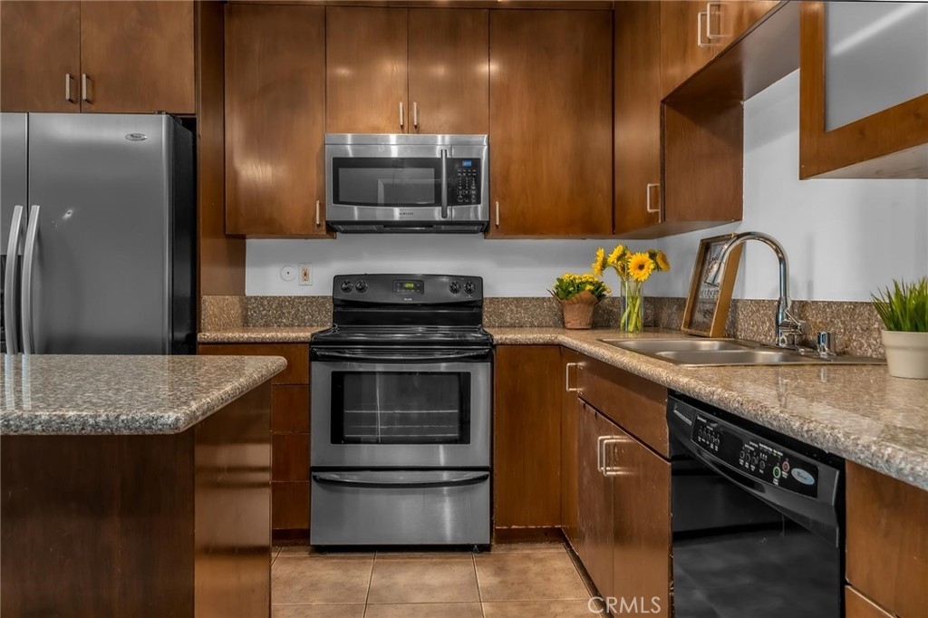 Perfect starter home in the heart of Sherman Oaks! This spacious light-filled condo offers an open-floor plan with two comfortable en suite bedrooms and bathrooms. The kitchen has a large island, granite counter tops and stainless-steel fridge, microwave and stove. The roomy primary bathroom has been renovated in 2021 and has a tub, a shower, and a dual sink vanity. The second bedroom opens onto a balcony that is also adjacent to the living room. This unit features bamboo, laminate and tile flooring, crown moldings, recessed lighting in living room, double-pane windows, central air/heat and washer/dryer. A new A/C unit was installed in 2021. This pet-friendly building has gated subterranean parking with 2 parking spaces side by side, a key-controlled elevator, an intercom and a security camera system. Additional amenities include a recreation room, pool, outdoor lounge a BBQ area. This prime location is next to the Sherman Oaks Park and Recreation Center, near the Westfield Fashion Square Mall, Trader’s Joe and has easy access to the 101 and 405 freeways. The perfect place to call home and a great value for Sherman Oaks!!!
