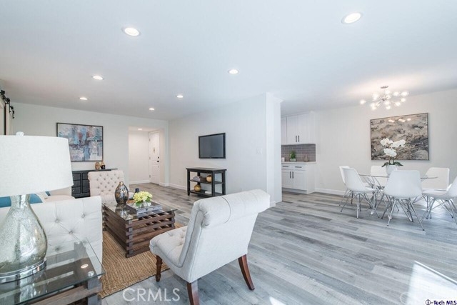 Gorgeously remodeled one level open concept condominium in Sherman Oaks, conveniently located just off Ventura blvd., bustling with great shopping, dining, and entertainment. Upon entering, you will find a spacious living area complete with recess lighting, stunning hardwood flooring, and a private-enclosed patio overlooking the serene garden-pool at the epicenter of the property. Just across the formal dining area/breakfast nook is an exquisite newly remodeled kitchen with white quartz counter-tops, top-of-the-line stainless steel appliances, and brushed nickel hardware on soft-close cabinetry. The master suite, complete with a grand walk-in closet and elegant Carrara marble countertop within the private en-suite bath will leave you in awe. The building's HOA offers many benefits such as: high-end security, maintenance throughout the property (pool, elevator, trash, etc.), also includes water coverage and earthquake insurance. A fully modernized, expansive 1,427 sq. ft. 3 bedroom and 2 bath home with double side-by-side parking spaces conveniently located just one floor below the unit has all the makings of a buyer's dream home.
