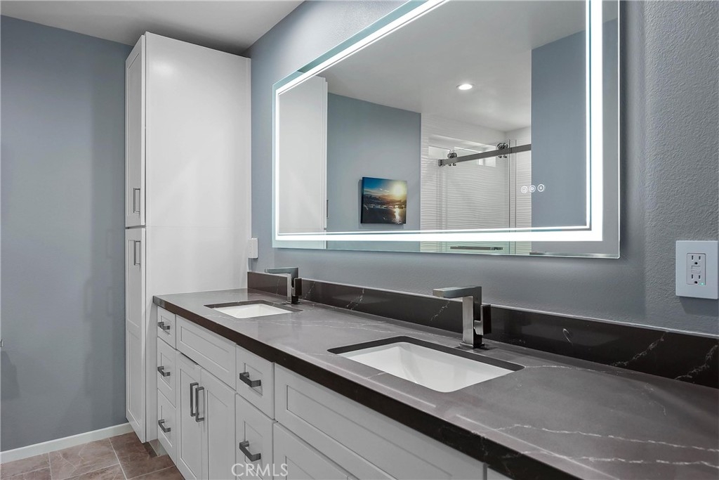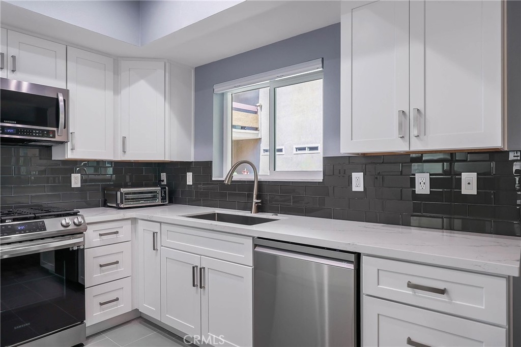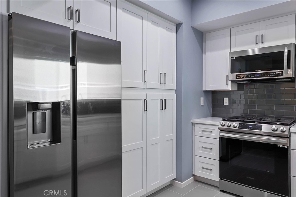 Experience both luxury and functionality in this stunningly remodeled 2BD/2BA single-level condo situated just north of Ventura Blvd. The home boasts modern convenience with Lutron light switches throughout and Hue smart recessed lighting in the living room and hallway. New light fixtures in the dining room and entry add sophistication to the space. The updated kitchen has glass tile backsplash, soft-close cabinets with pantry pullouts, Samsung appliances, farm-style sink and sparkling white quartz counters. Modern porcelain tile floors extend throughout the living areas while laminate wood-style flooring can be found in the bedroom spaces. The primary bedroom is spacious and has a custom-built Elfa closet system, while the main bath is entirely updated with quartz counters and a spacious walk-in shower with bench. Other amenities include new dual pane windows installed in Jan. 2021, custom Bali and Levolor window shades, Nest thermostat, and in-unit side-by-side Wi-Fi connected LG washer and dryer. The unit also features two balconies (off the living room and primary bedroom) and comes with two tandem parking spaces along with storage in the underground garage. The HOA fee includes water, trash, landscaping, pool service, common area maintenance, pest control, a common room, guest parking, and a master insurance policy. Enjoy easy access to exceptional shopping, dining, and the vibrant atmosphere of Sherman Oaks while also being just steps away from Studio City. Welcome!
