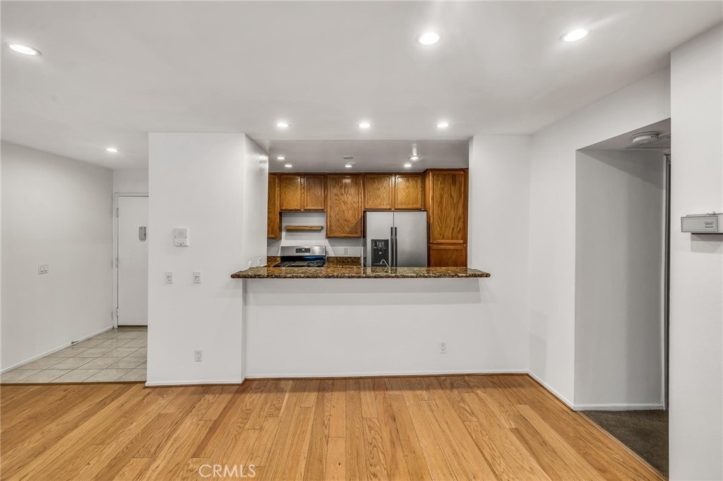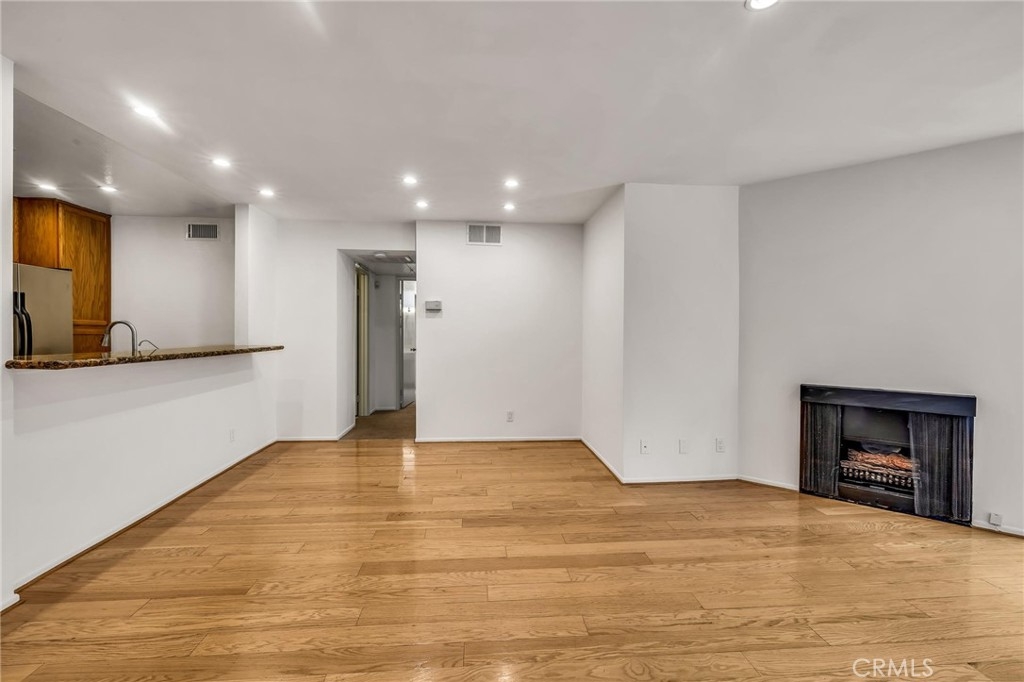 Come see this one level condo on the first floor. You will find a large enclosed patio which has access directly to the pool & spa area. This property has natural hardwood floors and a fireplace in the dining area and living room. A newer gas stove, refrigerator and a large pantry in the kitchen. The primary bedroom has a walk-in closet. The guest bedroom has two closets and a sliding door that has access to the patio area. This unit has only one common wall in the living room. There's good storage in the unit and also has additional storage in the building. Laundry area near the unit and easy access to the the 101 of 405 freeways.