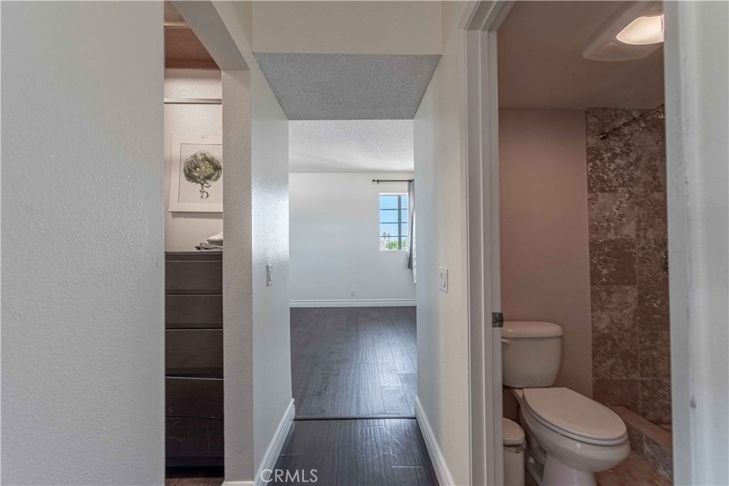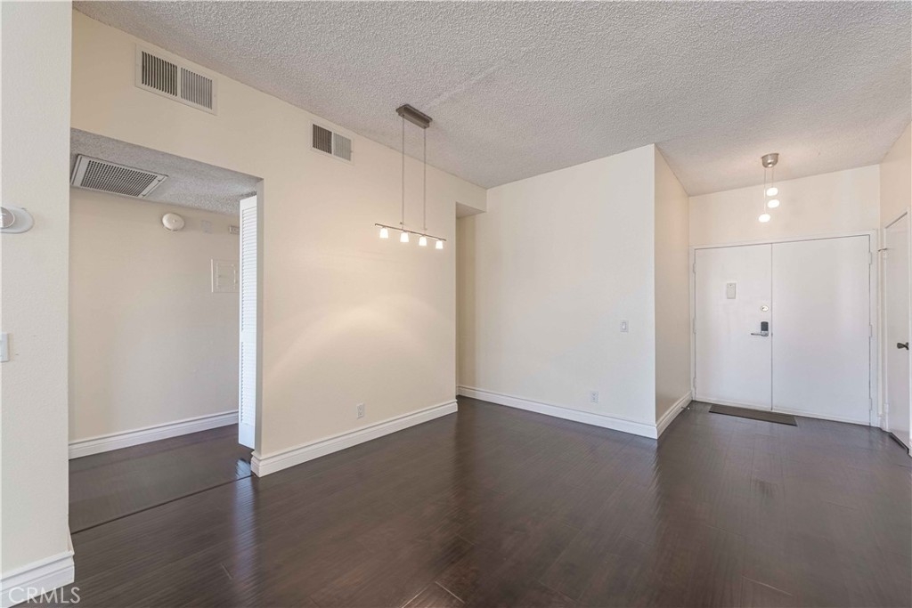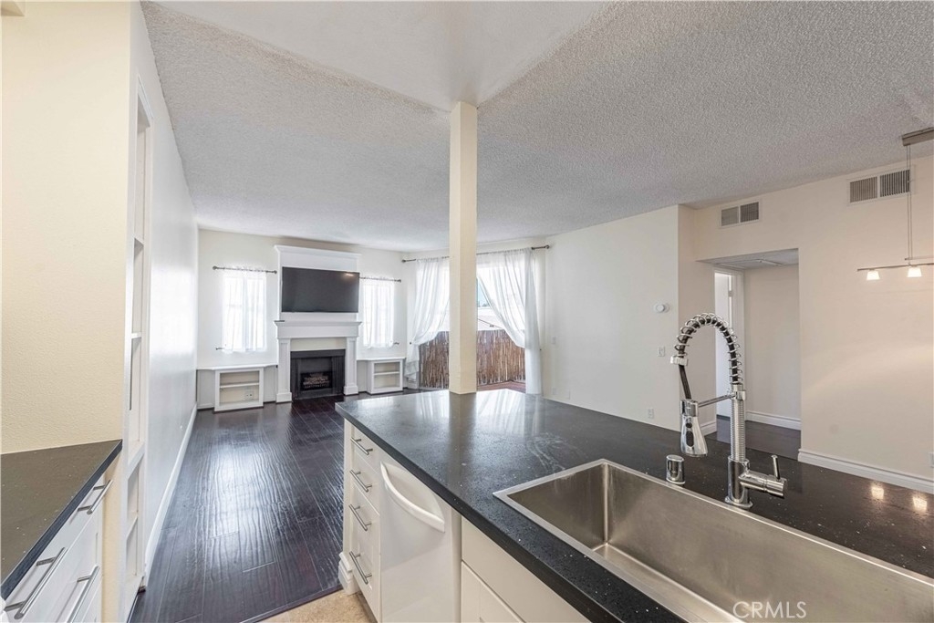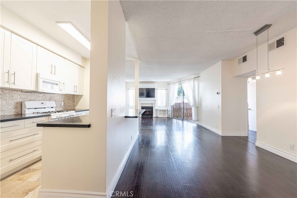 Discover luxury living in this remodeled condo with high ceilings and contemporary style. The kitchen features elegant black granite countertops, a farmhouse sink, skylight LED ceiling lights, and travertine floors, opening to a chic dining area and living room with a cozy fireplace. Hardwood floors flow throughout, complementing the remodeled bathrooms with stacked stone walls and travertine floors. Enjoy a master bedroom with a walk-in closet. Community amenities include a large pool, spa, gated security parking, and extra storage. Two car tandem parking spaces in a gated subterranean parking structure. Conveniently located near Ventura Blvd's shops, dining, and entertainment.