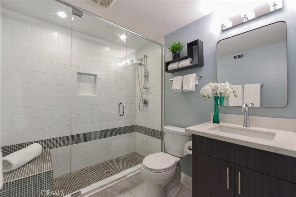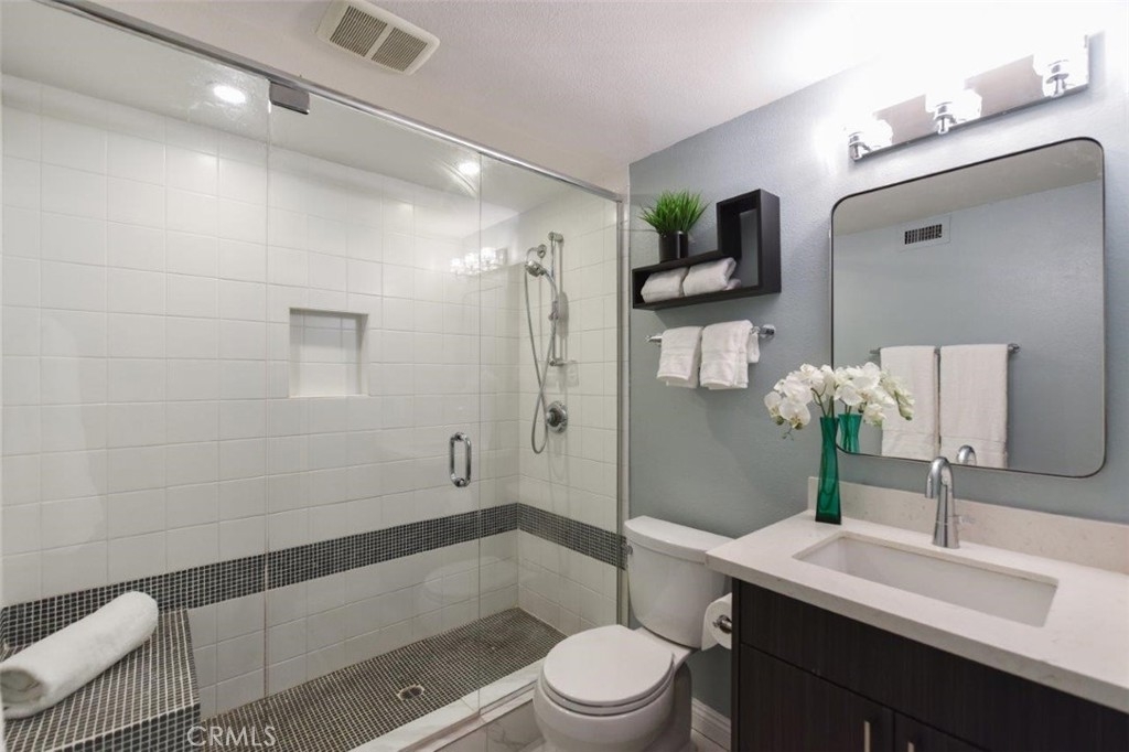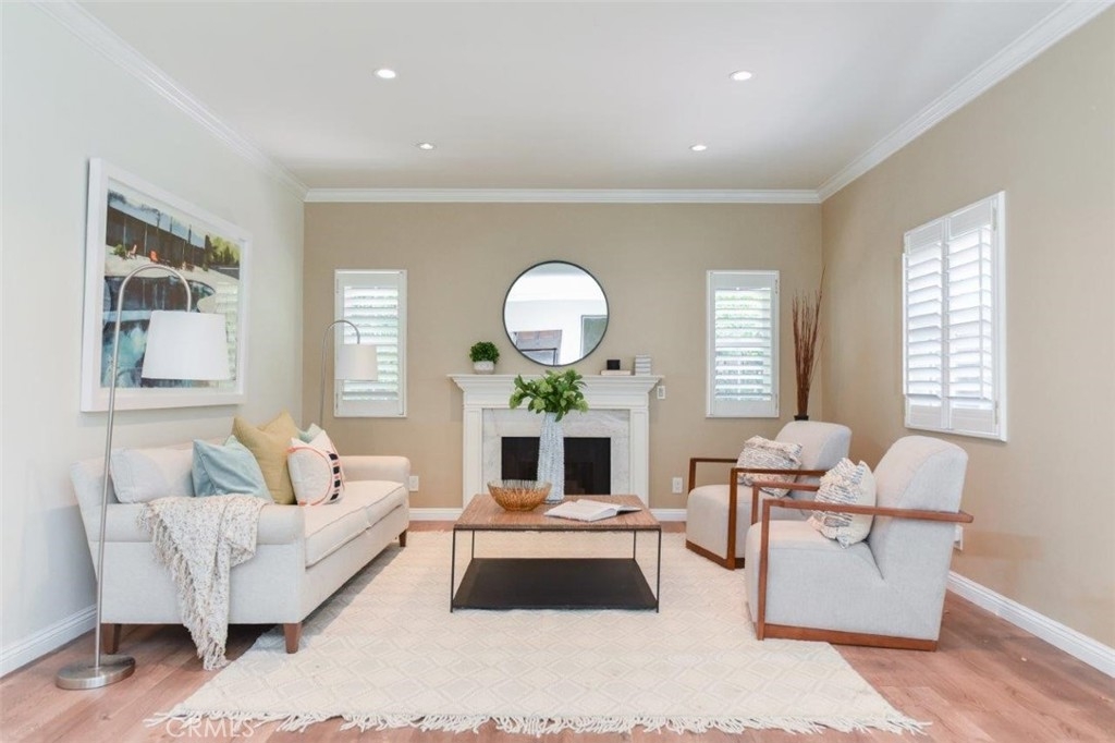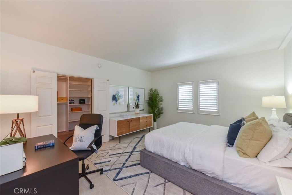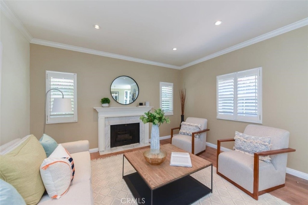 Beautiful condo feels like a single family house! No common walls! This 2 spacious bedrooms, 1.75 baths condo is renovated in 2020 with extensive upgrades including: New designer painting, new flooring, plantation shutters throughout, dual paned windows New carpet in both bedrooms; contemporary style bathrooms: new shower door, new vanity, new lighting fixture, new tiles etc Master Suite with walk-in closet & travertine spa bath with separate shower Abundant storage space including a second enormous walk-in closet with built in cabinet. Spacious Living room with inviting gas fireplace, convenient inside laundry Dining area with beautiful grand bay window, crown moldings, recessed LED lighting, 9 foot ceilings for an airy feeling of spaciousness, central air & heat Only 4 units in the complex & this is the only downstairs unit. There is also a bonus storage room in front of the parking spaces which can hold multiple bikes, etc. Covered tandem parking with gate controlled by wifi/remote control Exterior of the building was repainted in Feb. 2022
