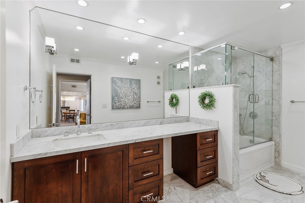 Sherman Oaks beauty just two blocks North of Ventura. This 2 bedroom, 2 bathroom, corner unit is ideally located within walking distance to shops, markets, restaurants, gym, etc. Unit is light and bright and features an open floor plan concept with high ceilings, an eat-in kitchen, 2 balconies, and an abundance of built-ins, closets, and storage. Side by side washer dryer area inside unit. The kitchen is accented by stainless steel appliances, and granite counter top on the breakfast bar. The large master suite has its own fireplace, 2 walk-in closets, and an updated bathroom with custom cabinets and Carrera marble. The AC and Heating systems were recently replaced. Two parking spaces and additional storage unit in the garage. This is a small, quiet building with earthquake insurance. Minutes to Ventura Blvd. shopping, entertainment and transportation.