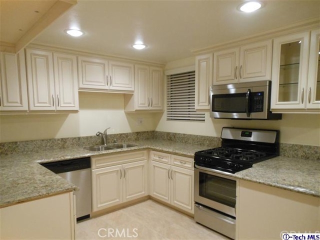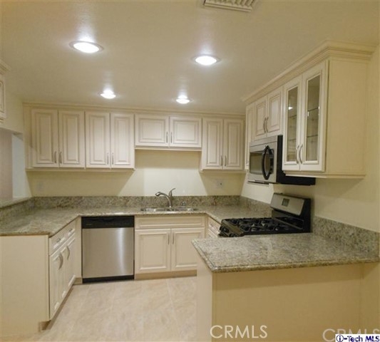 Totally redone all brand new in prime Sherman Oaks. Unit is a two story town home with a private patio. All laminate floors, beautiful fireplace in the living room. Brand new custom kitchen, granite counter-top, brand new appliances,cozy breakfast area. Formal dining room, washer/dryer hook-up in the unit. Two large bedrooms with their own baths. Brand new vanities, remodeled bath and showers.Vaulted ceiling in the bedrooms. Brand new custom window covering. Tw side-by-side parking spaces. Small building with only 6 units. Prime Sherman Oaks location, within walking distance to the new Ralph. Units sits away from Moorpark Street.