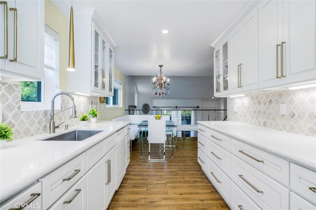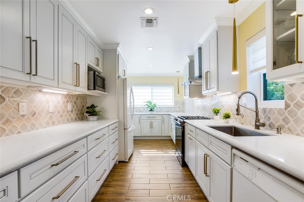 Beautifully Updated End Unit in the Highly Sought-After Oak Pointe Community in Sherman Oaks! This 3 bed, 3 bath 1,666 square foot townhome with 2-car attached garage is sure to impress. From the lofted ceilings, remodeled kitchen and baths, red oak wood stairs with modern stainless steel cable railing to the tile and wood-like laminate flooring (no carpet!), this unit has been tastefully appointed from top to bottom. The open-concept, split-level layout flows seamlessly from the kitchen and dining area to the living room with fireplace and outdoor patio. This entertainer’s dream is complete with a fully redone chef’s kitchen (2019) boasting new cabinetry, mosaic marble tile backsplash, quartz countertops, stainless steel sink with commercial pull faucet, stainless gas range with air frying feature and 30” hood. Conveniently located on the main level are the first guest bedroom and guest bath with shower. Upstairs are the two additional spacious bedrooms and two remodeled full baths. The main bedroom is a true suite offering a resort-like, en suite bath with dual sinks and large walk-in closet. Not only lovely to the eye, this townhome has been impeccably maintained with new Anlin windows and sliding patio door (2019), new American Standard heat pump and A/C unit (2020) and new custom Levolor banded roller shades (2019). The HOA has also been busy upgrading the exterior of the unit having just installed a new fiberglass front door (2021), new patio fencing (2021) and new “dusk-to-dawn” automatic exterior lights on the patio and front porch (2020). The Oak Pointe community is ideally located with easy access to the 405 and 101 freeways and this home has access to 2 of the community pools and spas, 3 tennis courts as well as 2 pet-friendly park areas found through the meandering pathways.