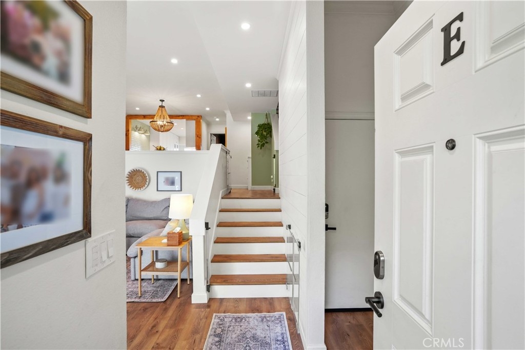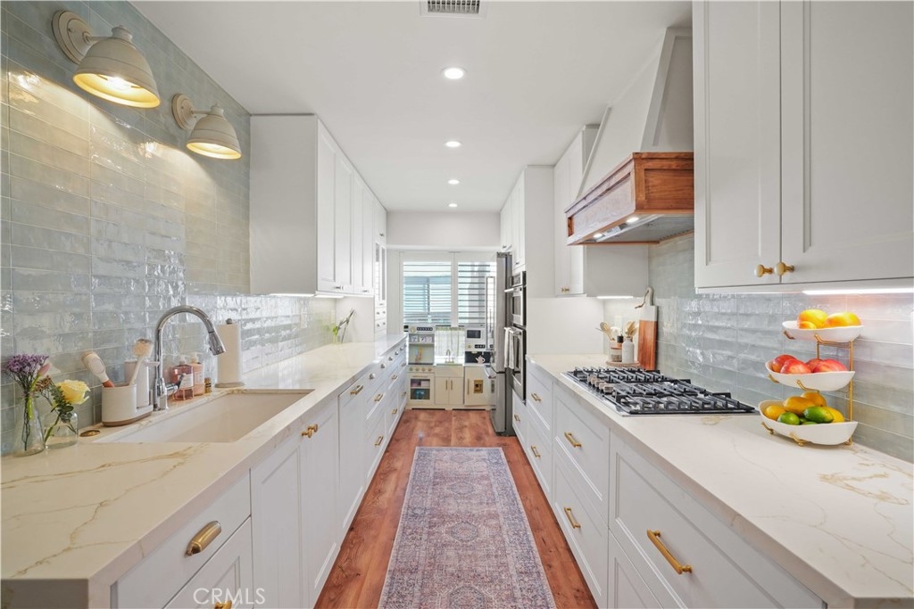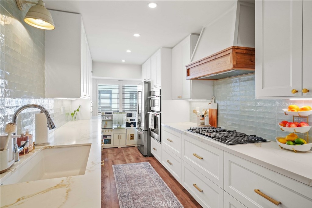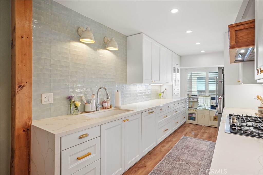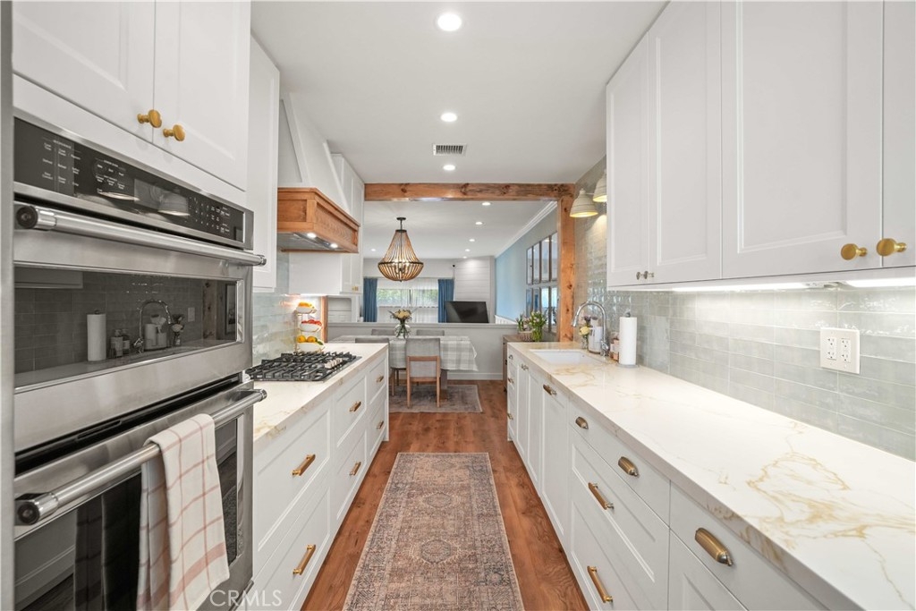 Exquisitely renovated Sherman Oaks townhome with elevated style and exceptional upgrades, located in the prime verdant enclave of the highly sought-after Oak Pointe Community. At the heart of the home is a newly reimagined kitchen designed with elegance and functionality in mind. A Bosch 5-burner cooktop with custom hood, Bosch dishwasher, and KitchenAid Oven and Mircrovave pair with an offset farmhouse sink, while striking waterfall quartz countertops and a counter-to-ceiling tile backsplash create a dramatic focal point. Soft-close cabinetry with in-cabinet and under-cabinet lighting and a custom pinewood threshold complete this showpiece kitchen—perfect for family living and entertaining. Soaring ceilings and abundant natural light enhance a split-level design where elegance meets comfort. Engineered hardwood flooring in rich wood tones flows throughout, while crown molding, plantation shutters, recessed lighting, and a gas fireplace with bespoke mantle add refined touches. Board-and-batten accents and custom shiplap bring warmth, texture, and architectural distinction. Sliding glass door opens to a sun-filled patio for coffee, BBQs, or gardening. Upstairs, the oversized primary suite includes space for a sitting area, dual closets, and an ensuite bath with dual sinks and shower-in-tub. Freshly carpeted stairs lead to a newly renovated laundry room with quartz folding counter and cabinetry. Direct 2-car garage access and a bonus 300 SqFt basement with shelving offer endless storage and hobby potential. One of the finest units in all of Oak Pointe, with exclusive access to the community’s only year-round heated pool, plus spa, tennis, pickleball, basketball, dog parks, green spaces, and pet friendly walking paths. HOA dues include water, trash, internet/cable, earthquake insurance, landscaping, and community events. Families will appreciate the Blue Ribbon Kester Avenue Elementary School within boundary, and the location offers walking distance to Ventura Blvd, shops, cafés, dining, and Sepulveda Basin Recreation Area with golf, trails, and sports fields. Quick freeway access completes the lifestyle. Don’t let this one-of-a-kind Oak Pointe residence slip away—schedule your private showing today and step into a home that truly stands apart.