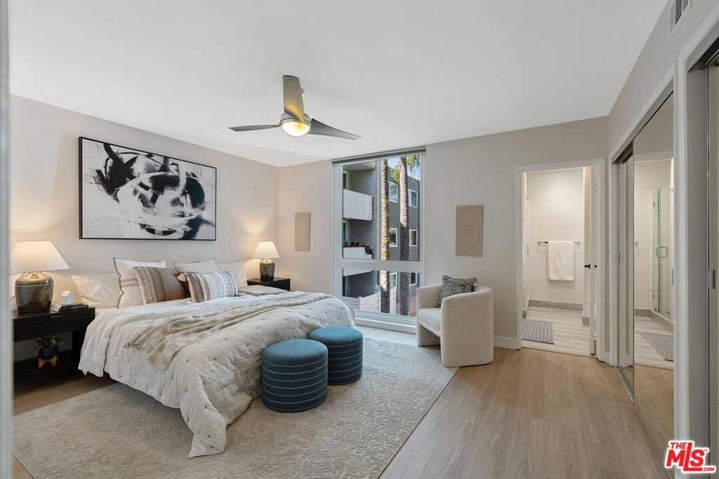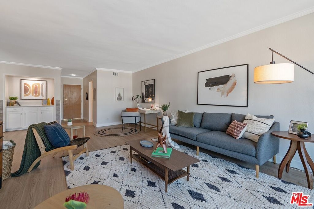 Don't miss the opportunity to make this beautifully upgraded condo with a touch of mid-century warmth your new haven. Discover your perfect space in this generous 2-bedroom, 2-bath with a sparkling view of the serene pool and spa. The unit is bathed in natural light thanks to floor-to-ceiling windows that bring the outdoors in. An open concept living/dining area seamlessly blends together, creating a spacious, welcoming environment that's perfect for both entertaining and enjoying quality time. There's even a place for an office. The kitchen boasts modern elegance with quartz countertops, a ceramic tile backsplash and up-to-date appliances making daily life a breeze. The bathrooms received a stylish makeover, featuring meticulously tiled floors and showers, the addition of new vanities, toilets and sleek shower doors. Enjoy enhanced privacy with honeycomb shades throughout and blackout shades in the bedrooms. Luxury vinyl plank flooring graces the entire residence, complemented by designer paint colors and newly installed baseboards and crown molding. The large balcony enhances the character and inviting atmosphere making this a contemporary and inviting place to call home. Complete with a 2021-installed air conditioner, ceiling fans and the convenience of two tandem parking spots in the gated garage. A pet-friendly building with earthquake insurance. Close to Sherman Oaks Park with pool, tennis courts, baseball fields, soccer fields, basketball courts, dog training classes, freeways, Westside and all the City has to offer.