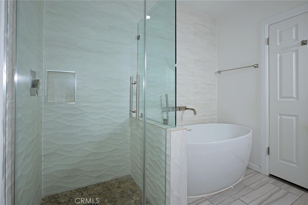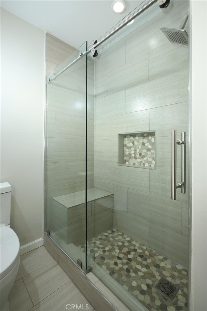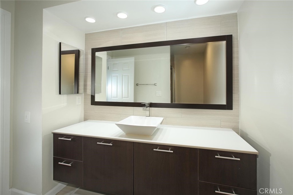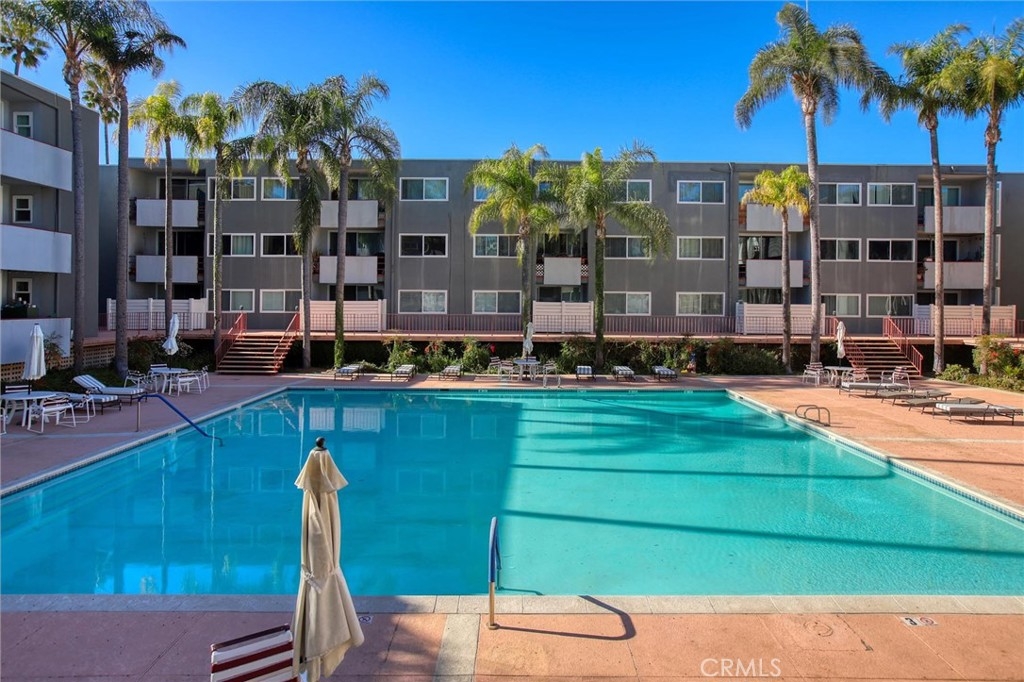 Top floor end unit condominium nestled in a mid-century modern building in prime Sherman Oaks. Featuring 2 spacious bedrooms and 2 luxurious baths, this home is designed for refined living. The expansive living room enjoys beautiful laminate flooring, recessed lights and an inviting dining area illuminated by a Le Klint pendant light. This living room opens to a covered balcony overlooking the pool. The exquisite kitchen offers custom cabinetry, under-cabinet lighting, a large farmhouse sink and stainless steel KitchenAid appliances, complemented by a sleek and seamless stone countertop and backsplash. Enjoy convenient features like pull-out drawers, a full pantry and stackable LG washer & dryer. The two bedrooms include a primary suite with two closets (including a custom walk-in) and a magazine-worthy primary bath. This indulgent bath creates a tranquil haven, with skylight, designer tile flooring, LED mirror, a stylish vanity, Toto toilet and a free-standing soaking tub and glass-enclosed shower featuring gorgeous Porcelanosa tile: a perfect space to unwind. The serene hall bath also delights, with skylight, beautiful floor to ceiling tile, and glass enclosed shower with a bench and pebble flooring. This interior condominium overlooking the pool includes access to community amenities such as this resort style pool, spa, and subterranean parking. Conveniently located close to freeways and the Westside. Don't miss your chance to own this breathtaking sanctuary in the heart of Sherman Oaks!