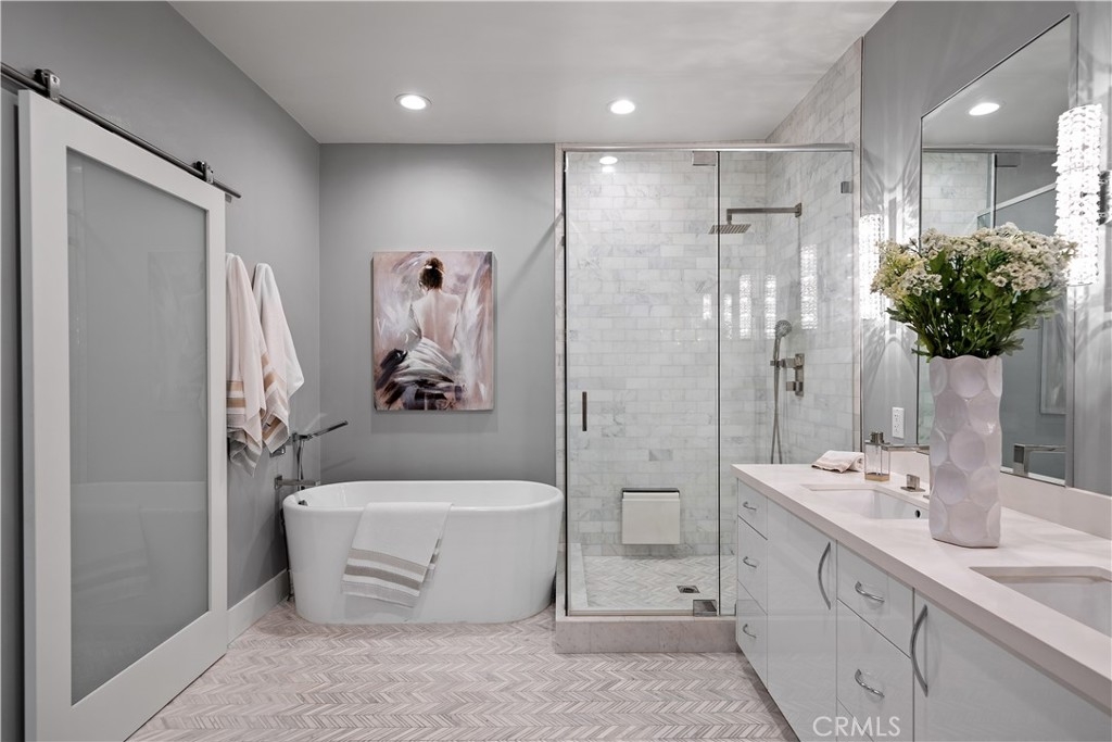 Absolutely fabulous remodeled one-level condo located in a prime location South of the Blvd in Sherman Oaks. This spacious condo is perfect for entertaining with an open floor plan which includes 2,197 sq ft and 2 bed/2 ½ baths. After entering through the double-doors you are greeted by the living featuring a charming fireplace and adjacent den, which is a cozy place to relax while watching TV or reading your favorite novel. The kitchen has been stunningly redone with custom cabinets, quartz counters, Thermador oven, subzero fridge and breakfast area. The master bedroom has a huge walk-in closet with en-suite bathroom featuring a soaking tub, separate shower with frameless glass and gorgeous vanity with dual sinks. There is also an additional sit-down vanity with sink in the master bedroom. The secondary bedroom includes an attached bath which has also been beautifully remodeled. Other features include recessed lighting throughout, a huge balcony off the living room and an exquisitely redone powder room. This quaint 9-unit building has an indoor pool & spa, sauna, gym and separate storage area. Walking distance to an abundance of shops and restaurants. Centrally located with easy access to the Westside, downtown and multiple freeways.