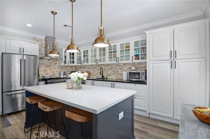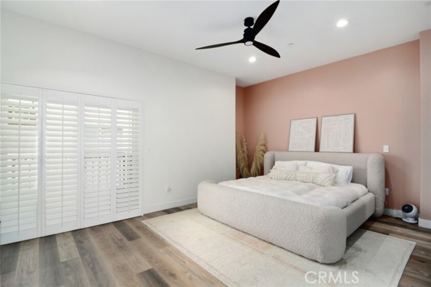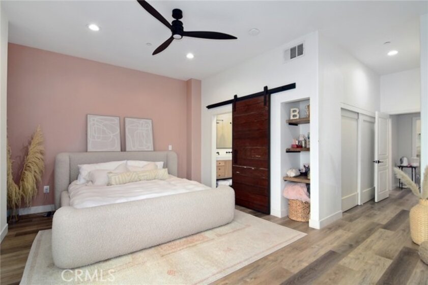 Looking to make a dazzling upgrade to your current living situation? You've hit the jackpot w/this rear of the complex located Sherman Falls townhome! 2 BEDROOMS + BONUS ROOM. Walk in & you're greeted by high ceilings, upgraded wide plank Oak style flooring, recessed LED lighting & a dazzling gas fireplace. A mesmerizing kitchen affords you a grand sized center-island w/QUARTZ counters, newer high-end stainless appliances, spacious pantry & real wood cabinets w/soft close drawers. Conveniently located HALF BATH downstairs featuring a concrete vanity & Kohler fixtures. Venture upstairs to discover DUAL MASTER SUITES & a spacious laundry room with SIDE by SIDE washer & dryer! The smaller suite still offers plenty of space and the same high ceilings and recessed lighting from downstairs. In addition, a spacious closet w/built-ins, wainscoting accent wall, oversized bathroom barn door, double pane windows and beautiful plantation shutters. The en-suite bath features a Kohler soaking tub & fixtures, custom glass shower door, imported Spanish hexagon tile & marvelous wall mounted floating concrete sink. The true MASTER SUITE is magazine worthy! Rejuvenating ceiling fan, a glass slider to a Juliette balcony, reclaimed wood barn door and more. The bathroom offers a skylight, 8' walk-in completely custom shower w/dual shower heads w/separate controls & linear drain. In addition, floor to ceiling tile, frameless shower panels, double vanity sinks offering wall mounted Kohler fixtures and Restoration Hardware pendant lights! Finally, make your way downstairs to discover 2 SIDE BY SIDE parking spaces w/direct access to the garage, a dedicated TESLA charger just for your unit, in addition to a spacious BONUS ROOM off the garage, perfect for a home office, gym, guest room, storage, etc.