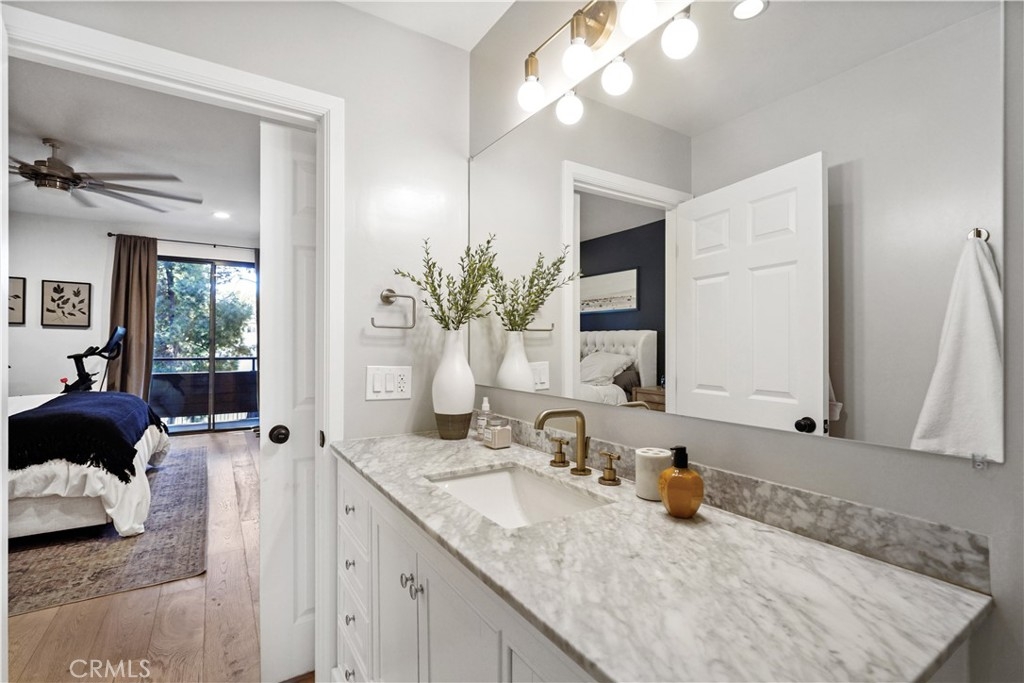 Rare, modern farmhouse style corner unit condo in a super fabulous location of Sherman Oaks! Feel privacy and security sharing no walls with your neighbors. Located just a few blocks from Ventura Blvd in the amenity rich community of Sherman Village close to restaurants and boutiques. HOA dues include Wi-Fi internet, basic cable, hot water, property & landscaping maintenance trash pick-up, and earthquake insurance. Amenities include two pools, a spa, sauna, gym, community room with a full kitchen, and plentiful parking with 2 guest parking garages! The professionally managed HOA has healthy reserves and is maintained impeccably. The community has recently upgraded the elevators, interior hallways, landscaping, gym, pool bathroom, and community room. Adjacent to the new multi-million dollar retail and lifestyle center in Studio City, The Shops at Sportsmen’s Lodge features iconic LA establishments Erewhon, Fred Segal (opening summer 2022) and Sugarfish just to name a few! Zoned to Dixie Canyon Elementary Charter School this spacious yet comfy & chic home offers much privacy set far from Moorpark St and features views of trees from all windows. Relax and unwind, enjoying the views from two private patios off the living room and primary suite. Home features high ceilings, a built in wet bar, upgraded wide plank flooring, recessed lighting and designer bathrooms with Carrara marble complimenting the elegant faucets and hardware. The spacious kitchen was recently updated and offers a new stainless steel dishwasher, new stove oven and new built-in microwave along with a French door refrigerator. The private laundry area is adjacent to the kitchen. With 2 beds, 2 baths, and 1,319 sq ft of living space, a primary suite with walk-in closet, an additional bedroom and bath this home is perfect for families, roommates and work from home life. Enjoy South Sherman Oaks living at it’s finest and see this home for yourself!