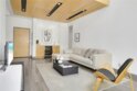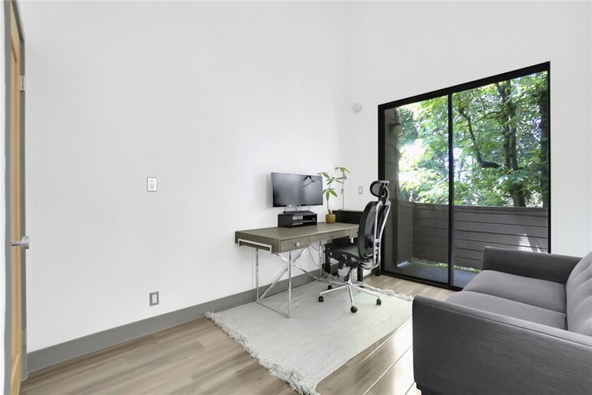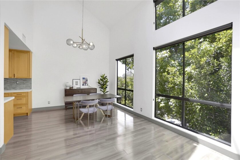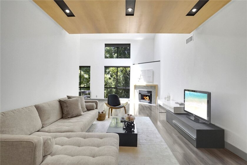 Experience contemporary sophistication in this stunning two-story loft-style private penthouse. Enter into a tranquil, tree-top retreat with scenic views of mature pine trees. This gorgeous, fully remodeled unit boasts soaring ceilings, beautiful laminate floors, and plush carpet in the master bedroom. The living room, featuring a cozy gas fireplace, opens seamlessly to the den, creating a perfect house alternative. The open floor plan includes a modern cook's kitchen with stainless appliances and quartz countertops. The master suite offers a luxurious bath and a spacious walk-in closet. The downstairs bedroom can function as a small den or office. Located in the heart of Sherman Oaks within the sought-after Sherman Village complex, this home is just a short walk from Ventura Blvd's shops and restaurants. There are two pools! HOA fees cover internet, basic cable, earthquake insurance, access to amenities, and a trash and maintenance service.