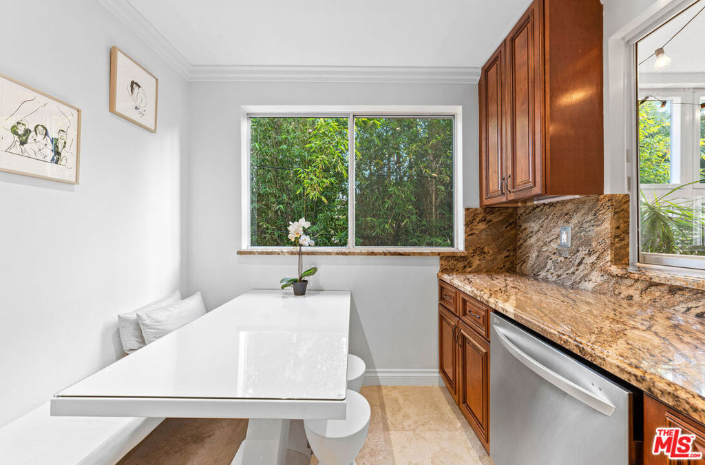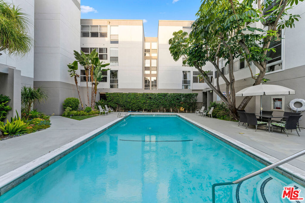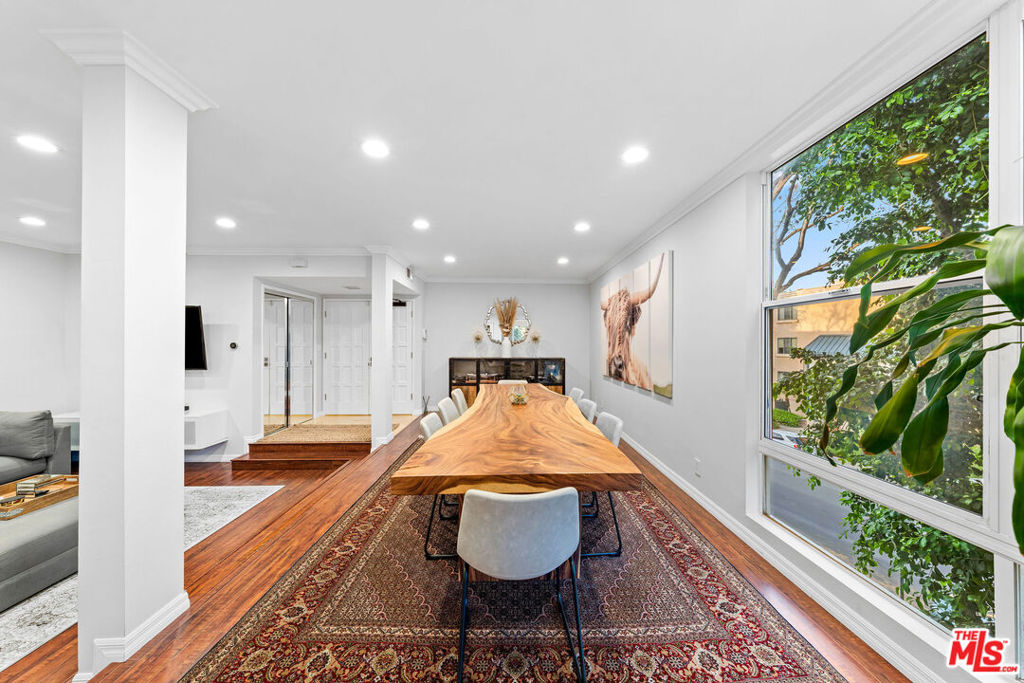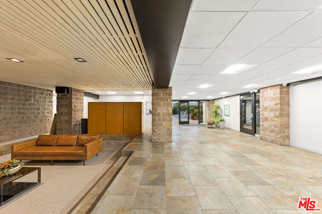 A bright, private corner-unit with high ceilings and tree views from every window located in the prestigious Sherman Villas complex. Double door entrance leads to an expansive, open living and dining room with recessed lighting and crown molding. An office/gym (enclosed balcony, not included in sqare footage) allows sunlight to flow through to living areas Bright kitchen featuring granite countertops/backsplash, stainless-steel LG fridge, built-in microwave, dishwasher, and double oven. Spacious primary bedroom features a large floor-to-ceiling window, dressing area, two closets: 1 walk-in closet & en-suite bathroom. Second bedroom has a large window and a closet. The second bathroom has glass-enclosed shower and updated tile and vanity. Complex is well maintained with mature trees, resort-style pool and spa, community room, gym, and well-lit, large, mid-century lobby. Secure main entrance, gated parking (with two reserved spaces and EV-charging ready), security cameras, and EQ insurance. Easy Westside and freeway access, close proximity to great restaurants and markets, and surrounded by beautiful homes on Stansbury and beyond. Don't miss this opportunity!