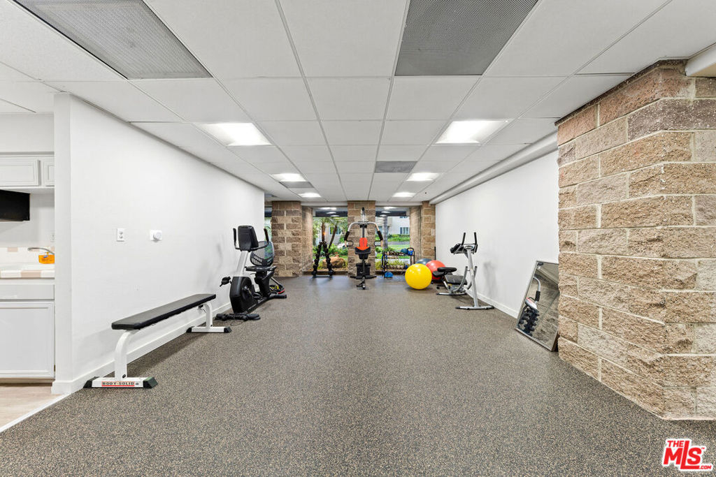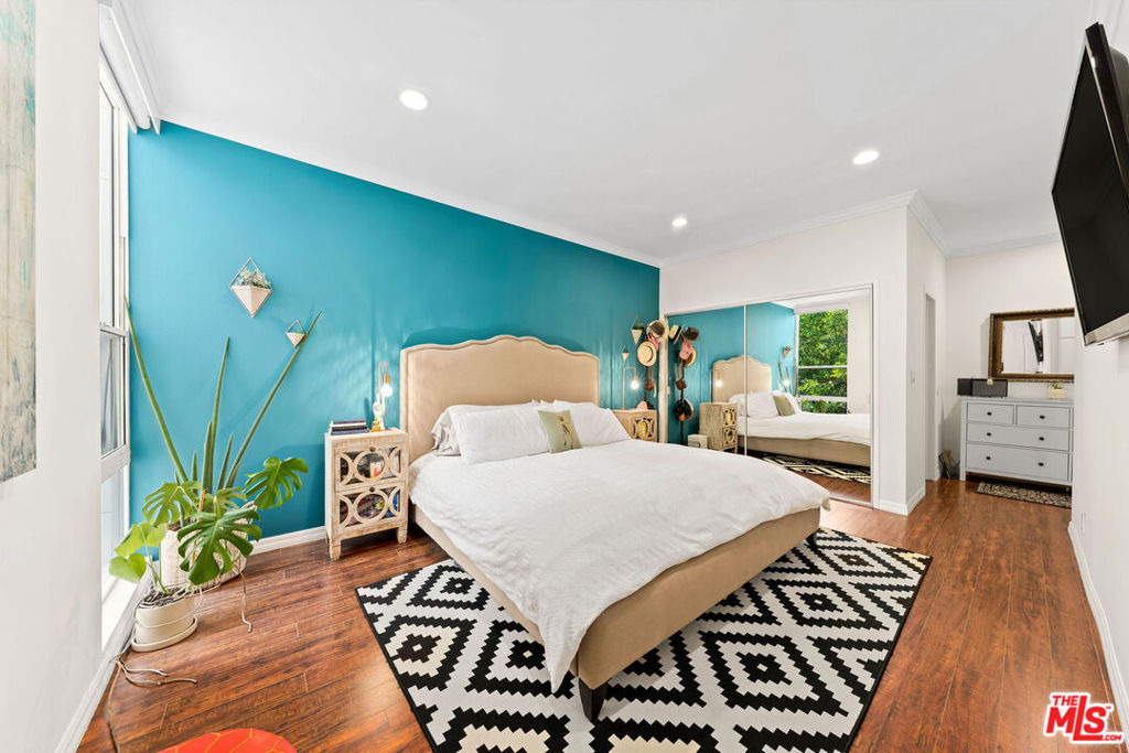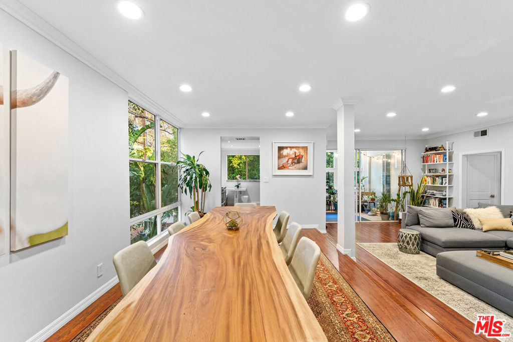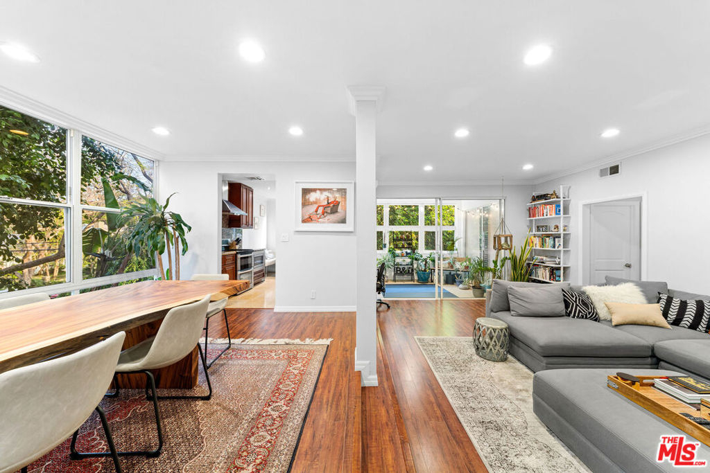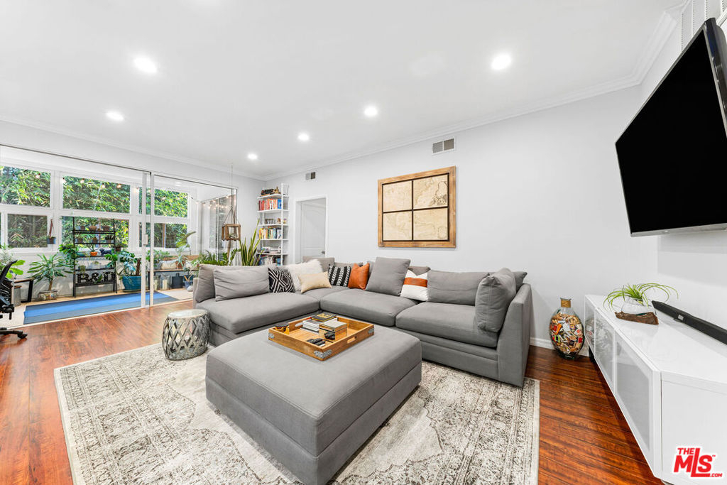 A bright, private corner-unit with high ceilings and tree views from every window located in the prestigious Sherman Villas complex. Double door entrance leads to an expansive, open living and dining room with recessed lighting and crown molding. An office/gym (enclosed balcony, not included in sqare footage) allows sunlight to flow through to living areas Bright kitchen featuring granite countertops/backsplash, stainless-steel LG fridge, built-in microwave, dishwasher, and double oven. Spacious primary bedroom features a large floor-to-ceiling window, dressing area, two closets: 1 walk-in closet & en-suite bathroom. Second bedroom has a large window and a closet. The second bathroom has glass-enclosed shower and updated tile and vanity. Complex is well maintained with mature trees, resort-style pool and spa, community room, gym, and well-lit, large, mid-century lobby. Secure main entrance, gated parking (with two reserved spaces and EV-charging ready), security cameras, and EQ insurance. Easy Westside and freeway access, close proximity to great restaurants and markets, and surrounded by beautiful homes on Stansbury and beyond. Don't miss this opportunity!