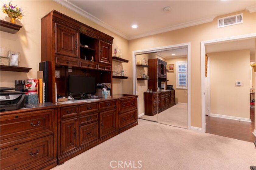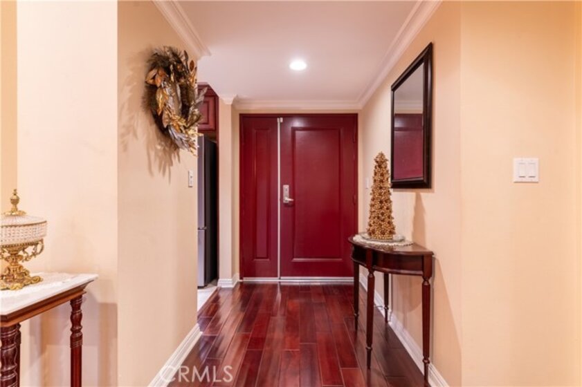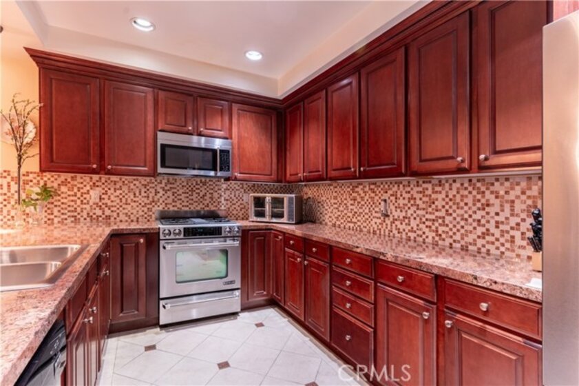 Welcome to Sierra Heights, a coveted 24-residence boutique building in prime Sherman Oaks. This rare end unit delivers approx. 1,800 sq ft with 3 bedrooms and 2.5 baths, exceptional privacy (only two homes in this section), and just one shared wall. A formal double-door entry opens to an expansive great room with recessed lighting, crown/base moulding and rich hardwood floors that lead to a wide covered balcony with treetop outlooks. The entertainer’s kitchen features granite counters, full-height mosaic tile, pendant lighting, designer cabinetry, dual sinks and stainless appliances including JennAir range & microwave, Bosch dishwasher and GE refrigerator, plus breakfast-bar seating. The king-size primary suite offers plantation shutters, a custom walk-in closet and a spa bath with dual sinks, marble counters, soaking tub and separate glass shower. Two additional generous rooms (ideal bedrooms/office/gym) are served by a beautifully tiled hall bath, with a stylish powder room for guests. In-unit stackable laundry, central HVAC and abundant storage throughout. Community amenities include controlled access, elevator, meeting room, guest parking, two assigned garage spaces for this unit and a private approx. 6’x7’ secured storage room. HOA dues are about $680/mo and include water, EQ insurance and common-area maintenance. All on a quiet, tree-lined street moments to Ventura Blvd cafés, the Galleria, Fashion Square and easy 101/405 access. Turnkey, spacious and beautifully finished, don’t miss it.