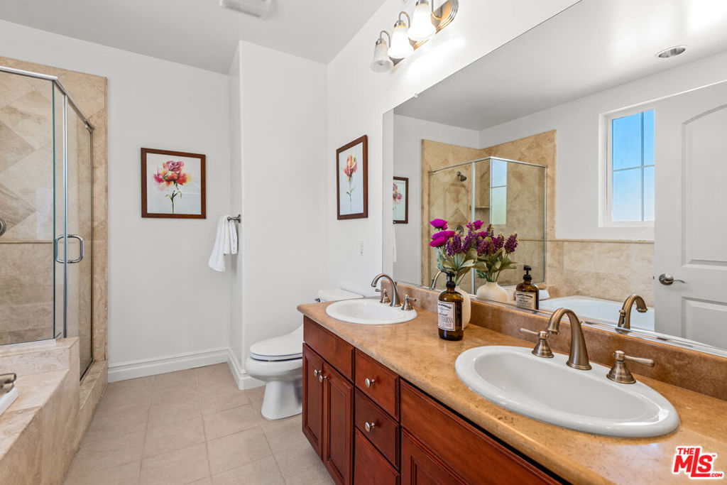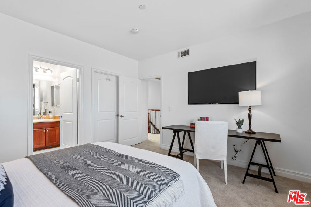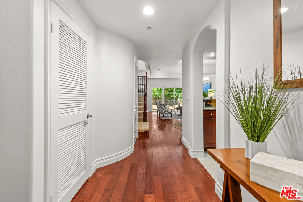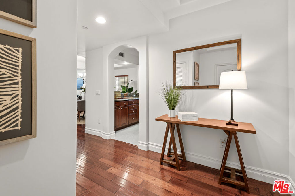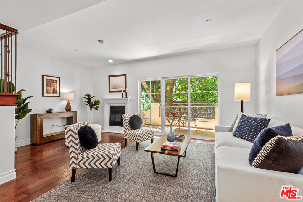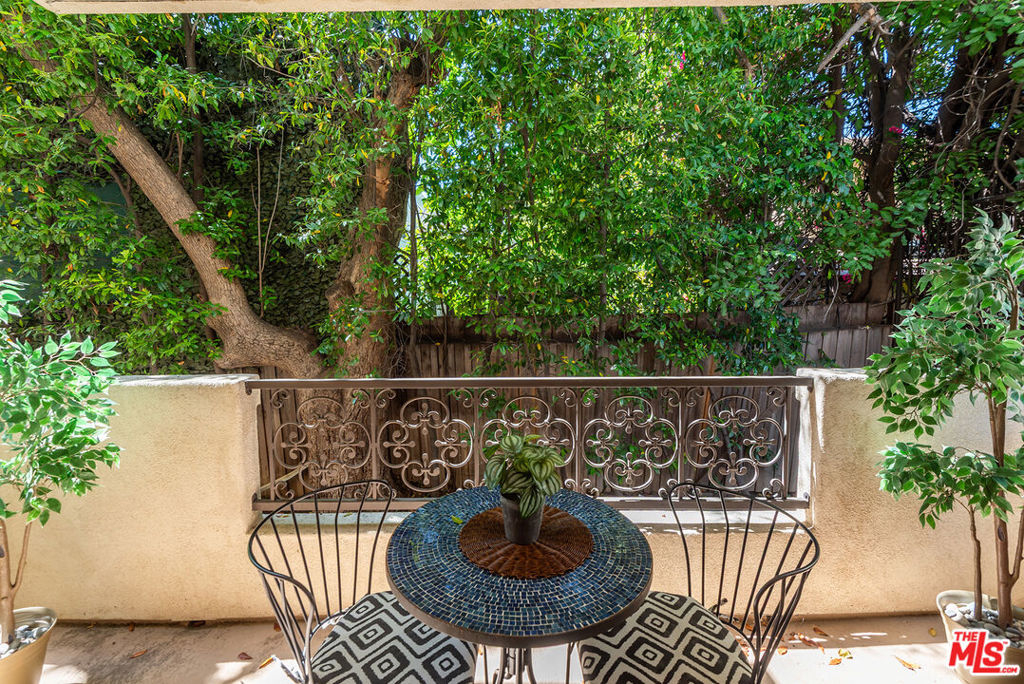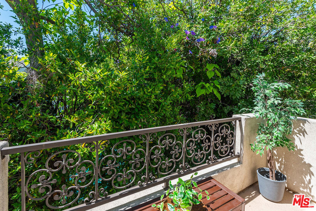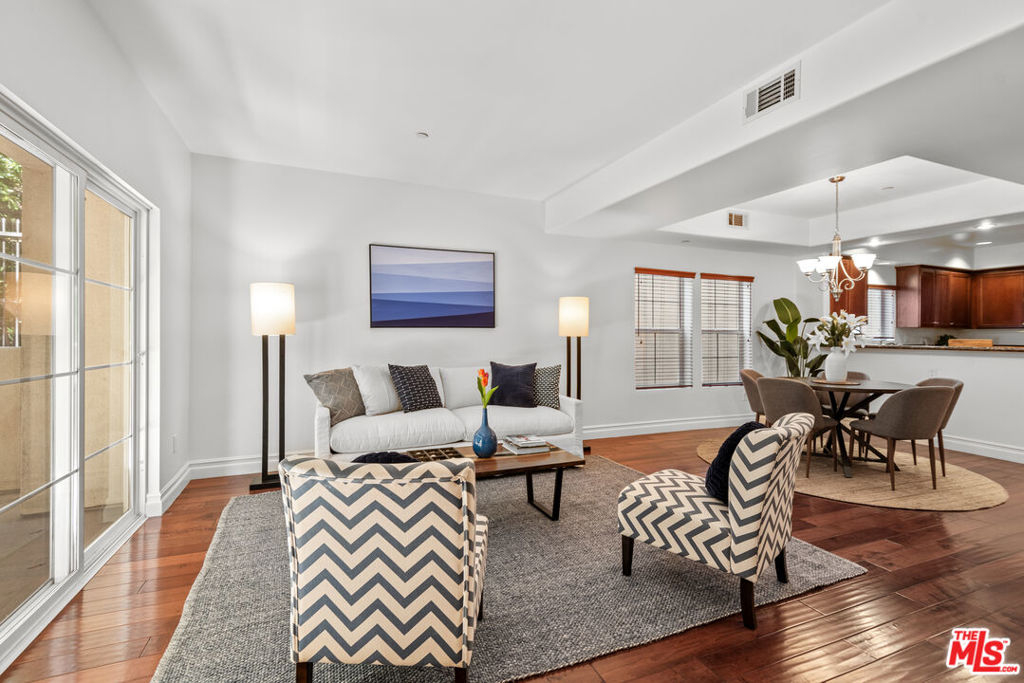 Immaculate, peaceful private rear/corner townhome unit. One of the premier locations in the building. Light dapples through the trees from both the living room and primary bedroom windows which creates a sense of serenity; your own oasis right in the middle of Sherman Oaks! Move-in ready, this two-story townhome features include: high ceilings in the living room and primary bedroom, coffered ceilings in the dining room, wood floors in public spaces, carpeted bedrooms and stairs, open floor plan, cooks kitchen with s/s appliances, granite counters, stone flooring and dark maple cabinetry, two private balconies, wrought iron and wood hand railing leads up the stairs to the primary retreat with walk-in closet, large spa-like bathroom with dual sinks, separate tub and shower. Two tandem parking spots with built-in EV chargers. Located conveniently near the 101 and 405 freeways, great shopping, restaurants, gyms.