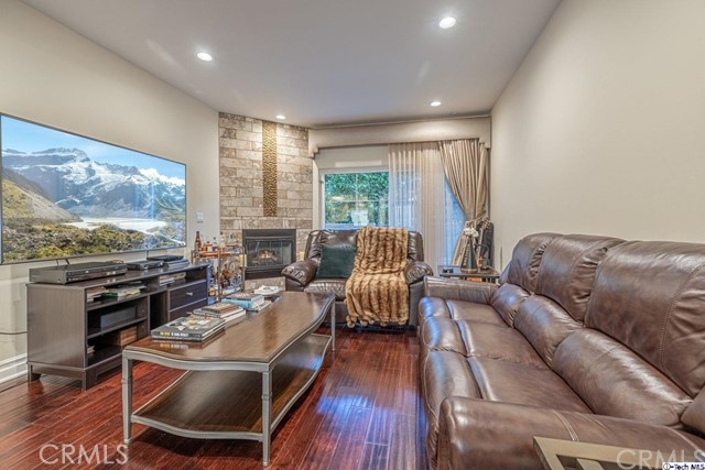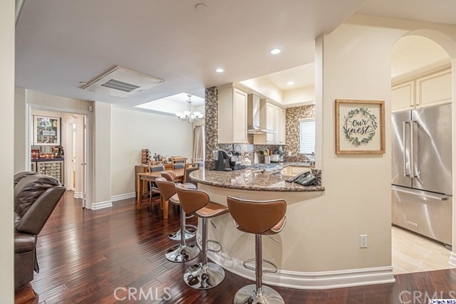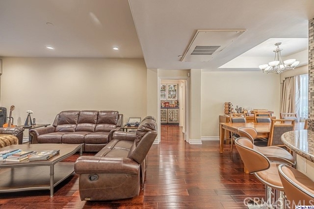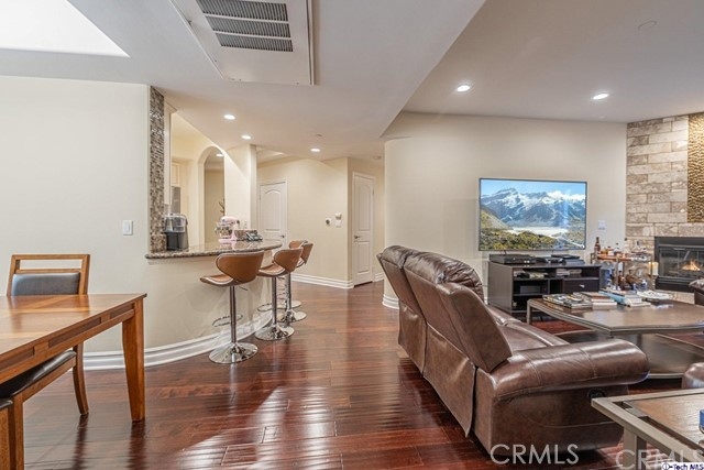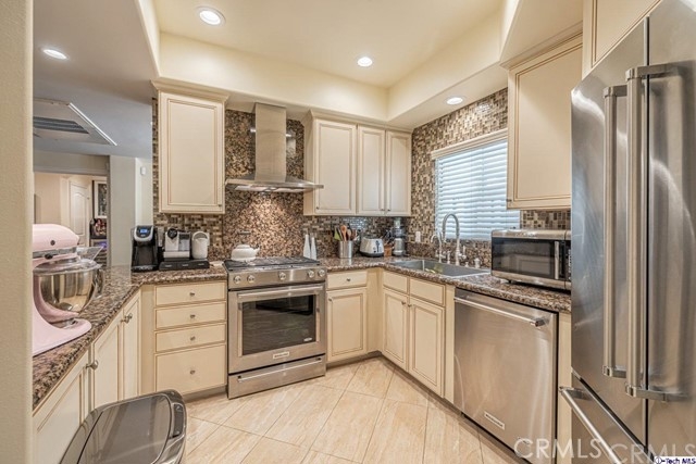 Don't miss out on the opportunity to own this completely remodeled 2 bedrooms & 2.5 bathrooms 1,300-Sqft condo in the trendy city of Sherman Oaks! It offers the warm and inviting feel of home. Enter the grand kitchen which includes built-in KitchenAid stainless-steel appliances, warm granite counters with complimenting mosaic tile backsplash, cream-colored cabinets, and opulent cream-colored granite floors. A round breakfast bar opens to the living room which offers a decorative fireplace with floor to ceiling stone tile, sliding door access to the private outdoor patio space which is exceptionally quiet and serene, plus recessed lights and laminate wood floors running throughout. The lovely dining room is highlighted by a tray ceiling and a center light fixture. Perfect for entertaining, there's the added bonus of a beautiful built-in glass-encased dry bar with a double door wine fridge, blue granite counters with mirrored backsplash, and optional party lights. The main bathroom offers a dual vanity sink, glass walk-in shower, and massaging jet jacuzzi tub with a light show. All bathrooms have been updated and feature custom, high-end marble flooring. The secondary bedroom includes a walk-in closet while the primary bedroom features two built-in closets with mirrored doors and ensuite bath. Plus, this home includes a convenient laundry space tucked away in a closet with added storage. Nearby Sherman Oaks Galleria, various shops plus easy Freeway access!