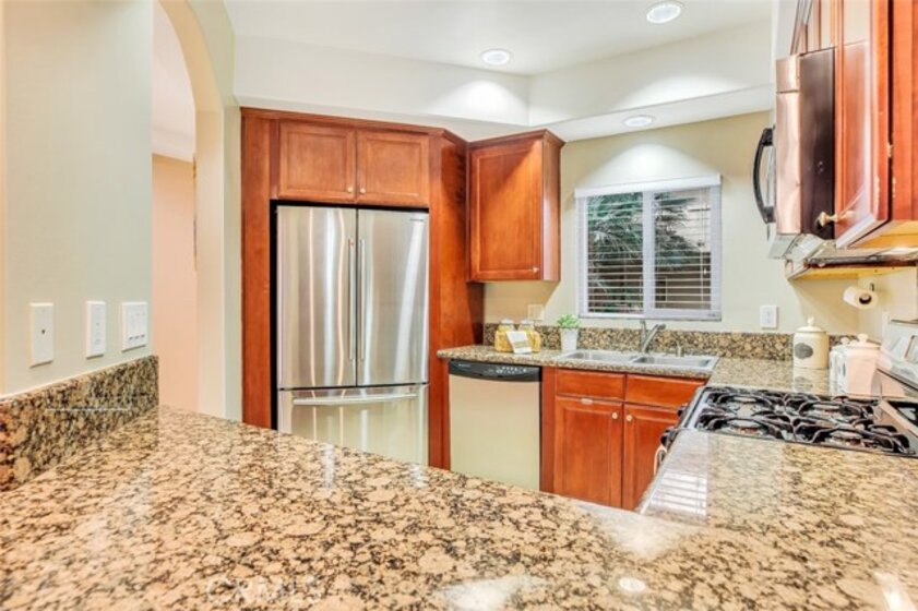 This charming condo is a must see! Fully updated, this home features hard wood floors throughout, fresh paint, recessed lighting and more. The kitchen has granite countertops with beautiful cherry oak cabinet. You’ll also love the modern bathrooms. There is an Italian style courtyard with community BBQ and a rooftop sundeck. The master bedroom features a great walk-in closet with master bath featuring a spa, shower and dual sink. Washer and dryer are in unit and the home also includes two parking spaces