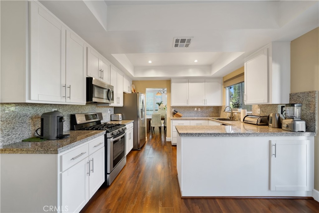 Beautifully remodeled corner-unit condominium in the heart of Sherman Oaks. Upgraded from top to bottom, this turnkey 2 Bedroom, 2 Bathroom condo features a split bedroom floor plan, privacy, and quaint elegance. The entry leads to a spacious living room, which is showered with tons of natural light from the expansive South-facing wall-to-ceiling windows and large living room balcony. A gas fireplace accents the center of the living space, along with a custom bar nook with a wine refrigerator and build-in shelving. The spacious, formal dining room is located off of the living room and along one of the entrances into the kitchen. The upgraded kitchen features granite countertops, new kitchen cabinets, stainless steel appliances, stainless steel sink, a breakfast area, and a second West-facing balcony. The Primary bathroom and secondary bathroom, both fully remodeled, feature newer bamboo wood vanities, quartz counters, new tiling, Toto toilets, and high end finishes and water fixtures. Engineered wood flooring flows throughout, along with upgrades and features such as new double pane windows, new sliding glass double pane balcony doors, recessed lighting, two walk-in closets, lots of extra storage central air conditioning and heating, plantation shutters, and a full size laundry in the unit. This 18-unit complex provides great amenities including a pool, spa, exercise room, secured entry, gated parking, EQ Insurance, and Location Location Location! Located a short walking distance to the best restaurants, shops, and bars which Ventura Blvd offers, and minutes away from the 101-to-405 fwy transition, this complex is central to the best features which the San Fernando Valley has to offer, while providing easy access to the West side and central Los Angeles.
