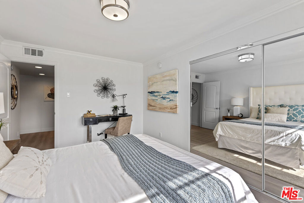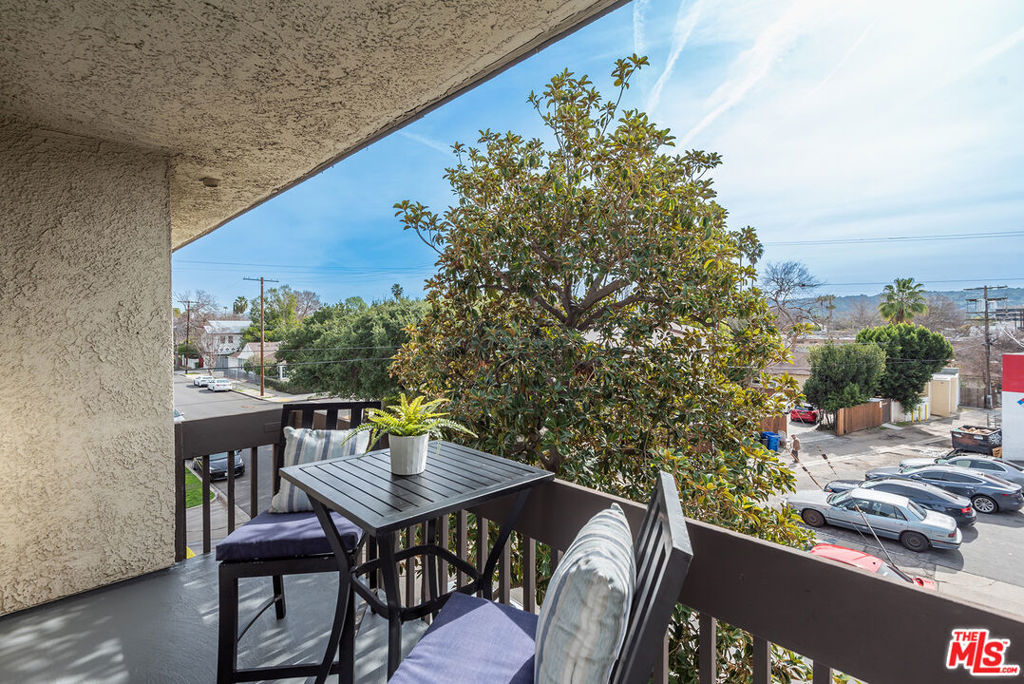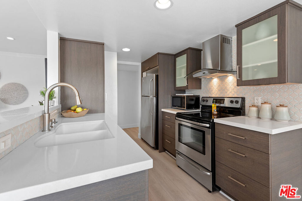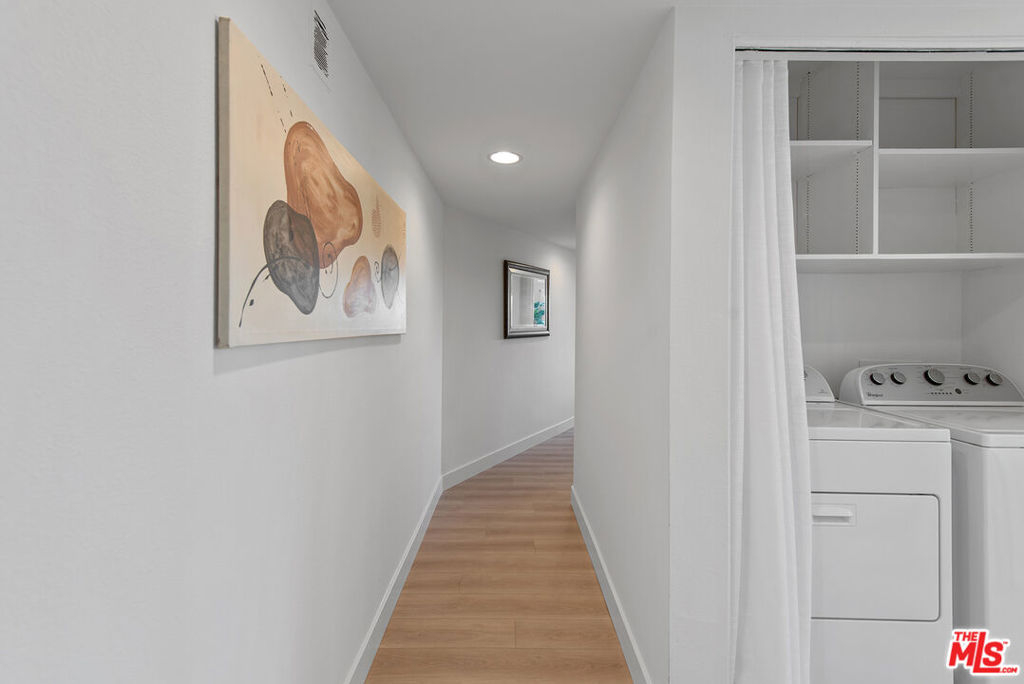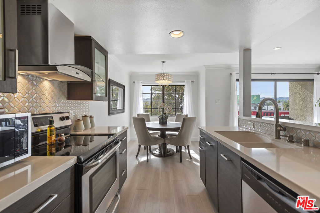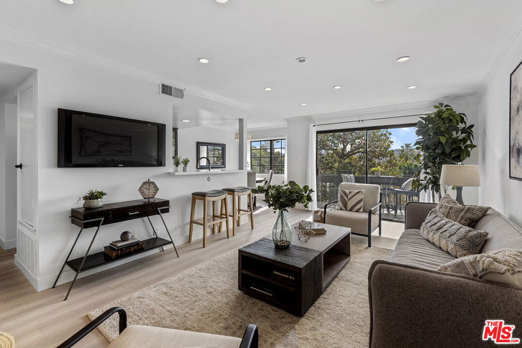 You will love this adorable, top floor unit! Recently redone and freshly painted with new wood-look plank flooring. Light, bright, open concept living room has South-facing balcony and mountain views. Smooth ceilings with recessed lights. Kitchen with stainless steel appliances, quartz countertops and breakfast bar. Hallway leads to side-by-side laundry area, 2nd bedroom with mirrored closet and designer 2nd bathroom with shower. Large primary suite has 2 separate closets and updated spa-like bathroom with frameless shower and rain shower head. Controlled access building, tandem parking. Centrally located near 101 & 405 freeways, close to Ventura Blvd., Fashion Square Mall and the Sherman Oaks Galleria.