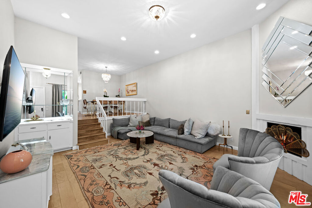 Experience the elegance of this beautifully designed split-level townhouse, centrally located in Sherman Oaks. This exquisite residence bathed in natural light, boasts two bedrooms, each with its own en-suite bathroom, providing both privacy and comfort. The inviting living space features rich hardwood floors, soaring ceilings, and recessed lighting throughout. The living room, complete with a wet bar and a gas fireplace, opens to a private patio that overlooks a sparkling pool, perfect for relaxation. The new gourmet kitchen features chef's choice stainless steel appliances with a gas range and custom cabinets. Elegant stone countertops and stylish wooden cabinetry with brass handle detailing add a touch of sophistication. A powder room is downstairs for guest convenience. The spacious primary suite includes spectacular primary bath with dual vanity and stunning marble and a large walk-in closet, while the second bedroom offers its own bathroom and closet. Enjoy resort-style amenities including a pool and spa, surrounded by lush, mature trees and outdoor seating. Additional conveniences include your own private direct access 2-car garage with a washer and dryer. Ideally situated near shopping, dining, and major freeways (405 and 101), this designer townhouse offers both luxury and convenience in a highly desirable Sherman Oaks location. This townhome has a brand new roof, newer HVAC (about 4 years new) and is equipped for EV charging.