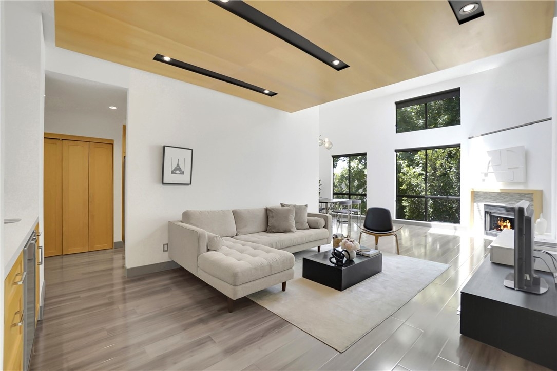 Experience contemporary sophistication in this stunning two-story loft-style private penthouse. Enter into a tranquil, tree-top retreat with scenic views of mature pine trees. This gorgeous, fully remodeled unit boasts soaring ceilings, beautiful laminate floors, and plush carpet in the master bedroom. The living room, featuring a cozy gas fireplace, opens seamlessly to the den, creating a perfect house alternative. The open floor plan includes a modern cook's kitchen with stainless appliances and quartz countertops. The master suite offers a luxurious bath and a spacious walk-in closet. The downstairs bedroom can function as a small den or office. Located in the heart of Sherman Oaks within the sought-after Sherman Village complex, this home is just a short walk from Ventura Blvd's shops and restaurants. There are two pools! HOA fees cover internet, basic cable, earthquake insurance, access to amenities, and a trash and maintenance service.