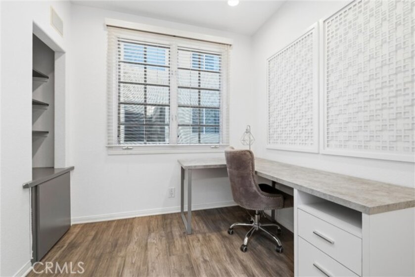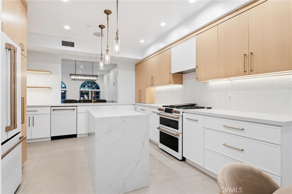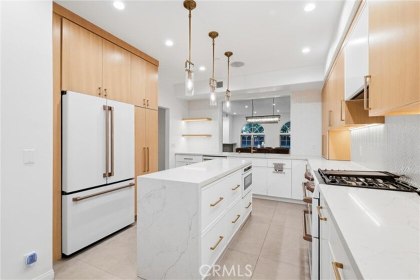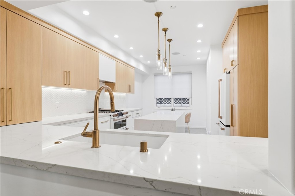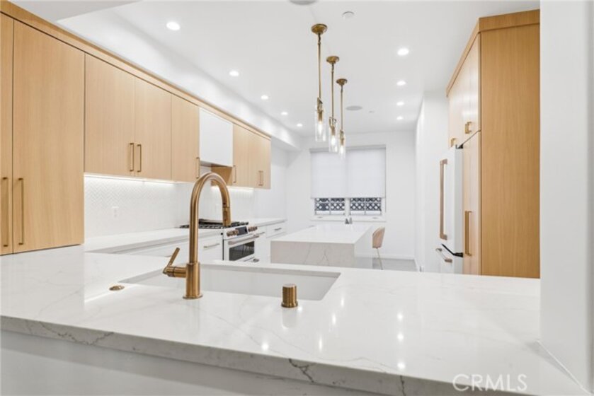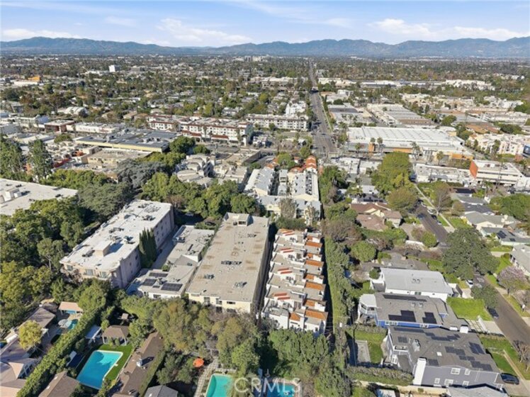 Spacious, bright, and beautifully updated, this 2-bedroom plus OFFICE townhome is ideally situated on one of Sherman Oaks’ most sought-after blocks between Stansbury and Hazeltine, just moments from the shops, dining, and lifestyle amenities along Ventura Boulevard. A formal foyer welcomes you into a thoughtfully designed home featuring in-ceiling surround sound, multiple private patios and balconies, direct access to three parking spaces, and a large in-unit laundry room updated in 2024. The oversized designer chef’s kitchen, remodeled in 2022, showcases custom wood cabinetry, chevron tile backsplash, tile flooring, Café appliances, a generous center island with dining nook, and abundant counter and storage space, all accented by curated lighting and designer finishes. An elegant dining room flows seamlessly into the sun-filled living room, where Palladium-style windows crown French doors that open to a private patio—ideal for BBQs and al fresco dining. The redesigned powder room adds a touch of modern luxury with custom hardware and refined finishes. The primary suite is a serene retreat featuring vaulted ceilings, a sitting area, walk-in closet, and French doors leading to a private balcony with tranquil treetop views. The spa-inspired primary bath offers dual sinks and a recently remodeled soaking tub. The second bedroom includes a walk-in closet and an updated adjoining bath. An expansive rooftop deck provides nearly 180-degree views, perfect for entertaining or unwinding at sunset. Additional highlights include a tankless water heater installed approximately two years ago, quick access to the 101 Freeway and nearby canyon roads to the Westside, and close proximity to Ventura Boulevard dining, shopping, Ralphs, and the new Whole Foods. This meticulously maintained building renowned for its lush, mature landscaping and inviting curb appeal.