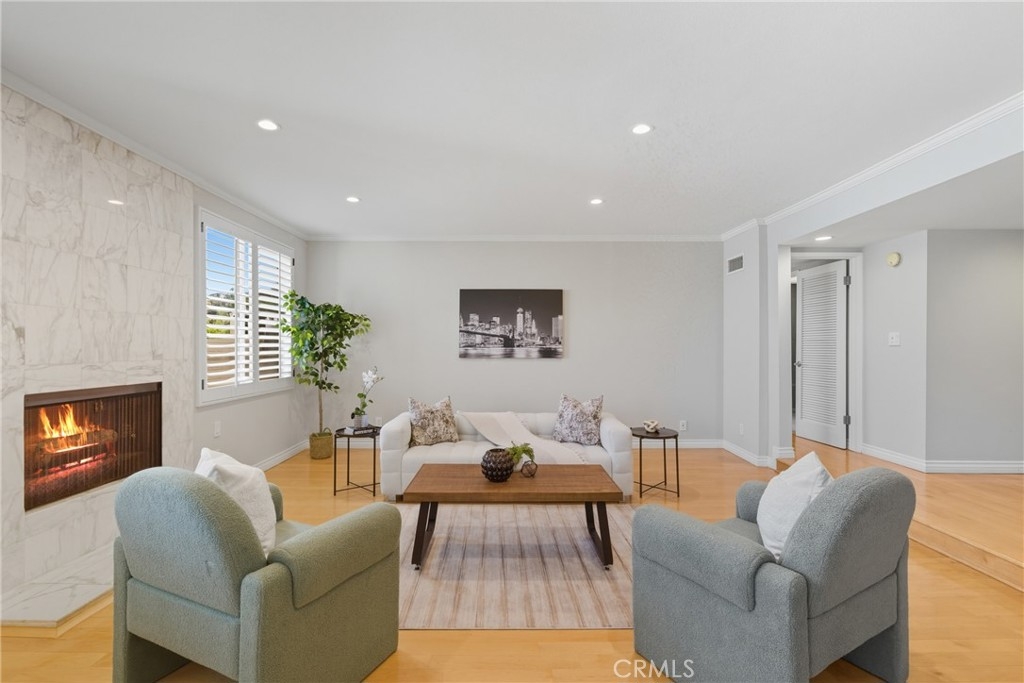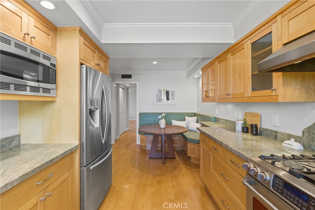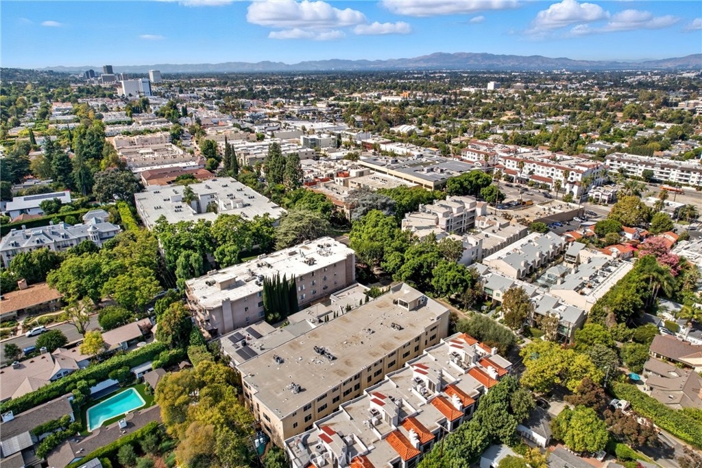 Modern Sherman Oaks Condo with Stunning Valley Views. Welcome to this beautifully updated 2-bedroom, 2-bath condo in the heart of Sherman Oaks, offering picturesque views over tree-lined streets and stretching all the way across the Valley to the Santa Susana Mountains. With an open-concept layout and sunlight pouring into every room, this home perfectly blends comfort, style, and convenience. The remodeled kitchen is a standout, featuring custom cabinetry, granite countertops and backsplash, built-in seating, stainless steel appliances, a gas range, and refrigerator. Hardwood floors run throughout the unit, accented by recessed lighting, plantation shutters, and charming bay windows. The spacious living room boasts a cozy marble fireplace, perfect for relaxing evenings. The primary suite offers a walk-in closet and a remodeled en-suite bathroom with a custom dual-sink vanity, granite countertop, and a fully tiled shower. The secondary bedroom features a large closet and easy access to another stylishly upgraded full bath. Additional highlights include central air and heat, two reserved spaces in the gated underground garage already wired for EV charging in your own space. Community amenities include a pool, spa, and fitness room. All of this is just a block from Ventura Boulevard's best dining, shopping, and entertainment, including Bacari, Schatzi’s, The Local Peasant, Mendocino Farms, and Ralphs. Quick access to the 101 and 405 freeways and top-rated schools like The Buckley School make this a rare find in one of the Valley's most desirable neighborhoods.