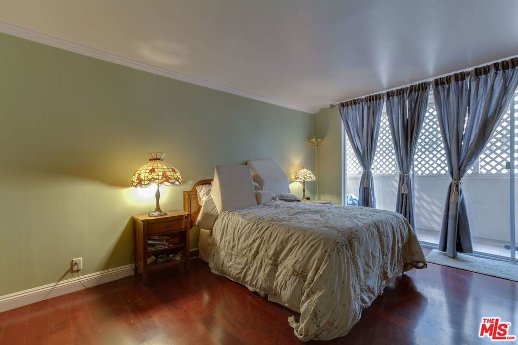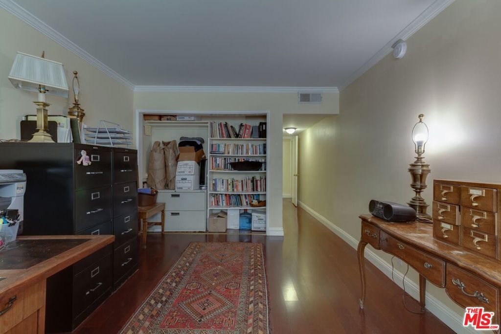 Easy drive to CBS, Burbank, Paramount studios. Don't pay those westside prices. This has all that you want! Pied a terre? Excellent location for getting to favorite restaurants, houses of worship, top grocery stores like the newly built Pavillions, Whole Foods. Private schools nearby. Use one of canyons to get over the hill. One story, south of Ventura Blvd. Faces the rear side of the building. End unit & has a long balcony for all of your plants & is accessible from both bedrooms. Good bones, hardwood floors throughout, beautiful crown molding and baseboards. Very large master w walk in closet. Galley style kitchen, lots of cabinets, double oven and a low noise dishwasher. Tons of storage & shelving built into the hallway & office. Second bedroom is currently being used as an office. Pool, Spa, BBQ. Earthquake insurance, water & trash are included in the HOA fee. Building does not allow laundry in unit or gas appliances. 1 security parking space. Best deal south of Ventura!