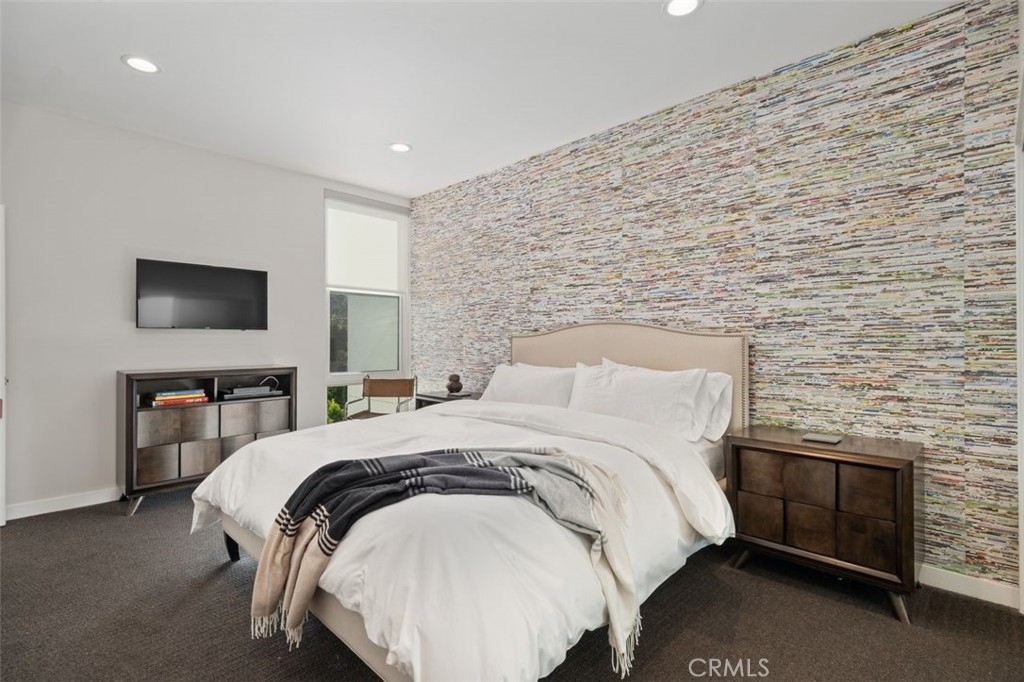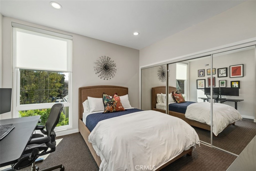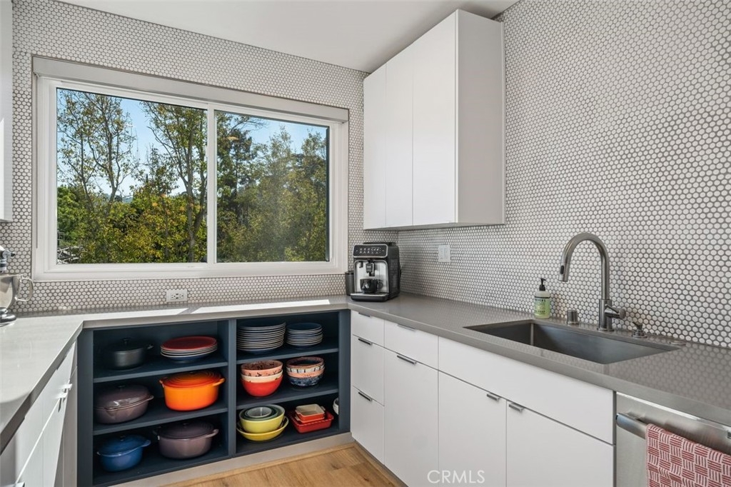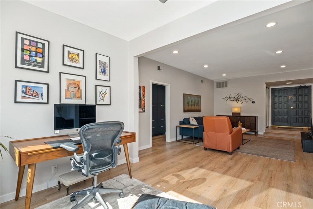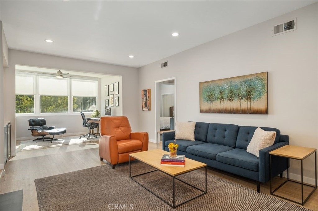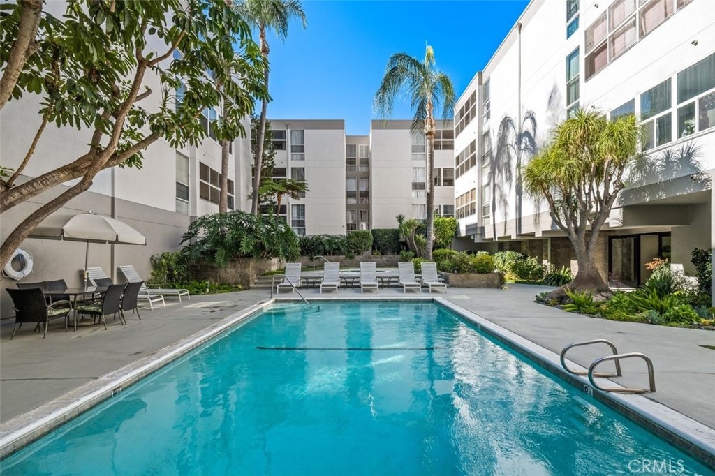 South of the Blvd, sun-drenched penthouse with high ceilings and beautiful views from every window in the prestigious Sherman Villas complex! Double door entrance to expansive, open floor plan living and dining rooms with recessed lighting. Stunning vinyl flooring throughout. Kitchen is bright with stainless GE refrigerator, dish washer, built-in microwave and storage. Custom-built quartz coffee and wine bar complements the living room and leads to opened up den that allows sunlight to flow through to living areas. Spacious primary bedroom features a dressing area with walk-in closet with adjustable shelves and 1 deep reach-in closet, and en-suite primary bathroom containing a glass enclosed custom shower/bath. Second bedroom features large floor-to-ceiling window and large closet. Second bathroom has a glass-enclosed shower with updated tile and vanity. Complex is well maintained with mature trees, resort-style pool and spa, community room, gym, and well-lit, large, mid-century lobby. Secure main entrance, gated parking (with two reserved spaces and EV-charging capability), security cameras, and eq insurance. Easy Westside access, close proximity to great restaurants and markets, and surrounded by beautiful homes on Stansbury and beyond. Don't miss this opportunity! See supplements for a complete list of upgrades completed in 2019 and 2020.