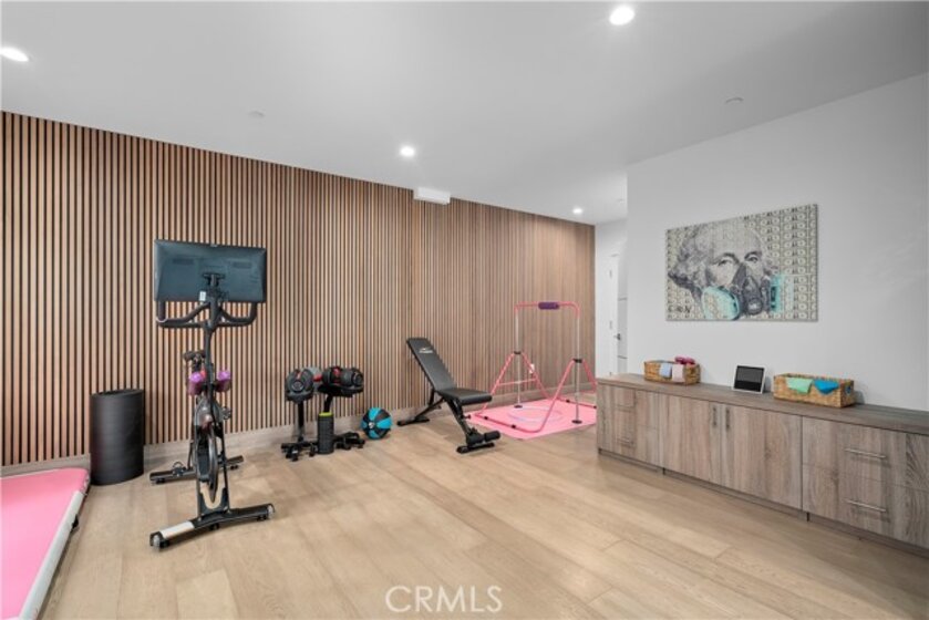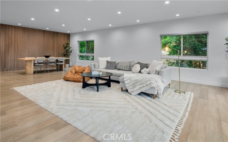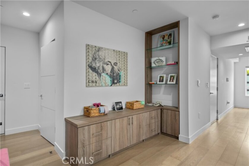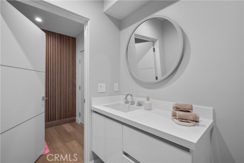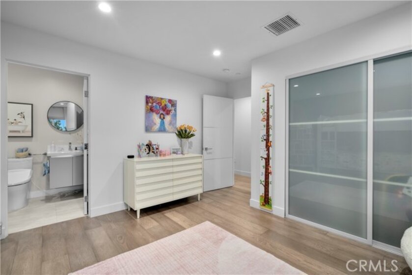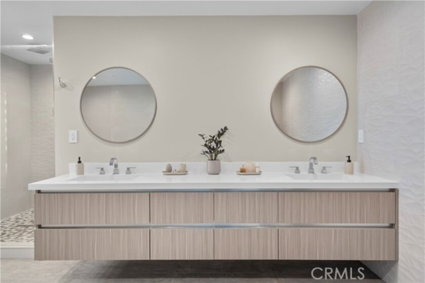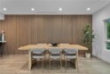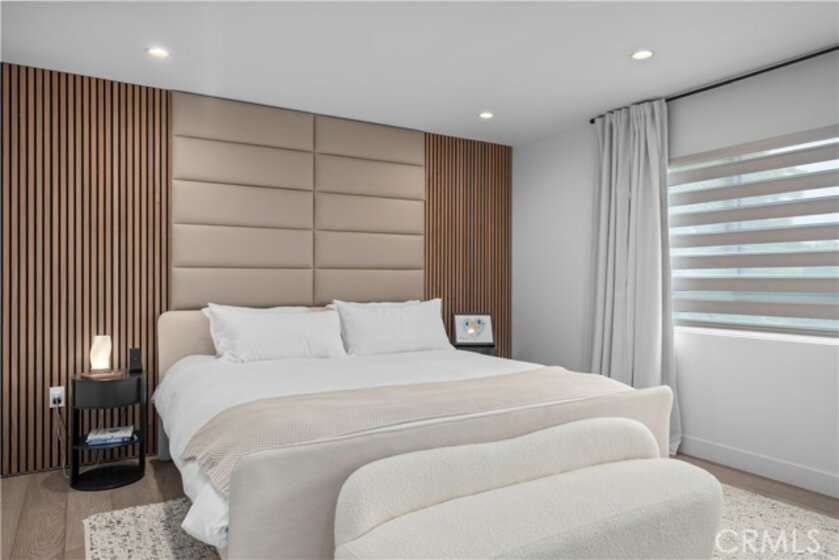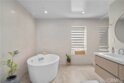 Elevate your everyday experience with this brilliantly designed living space that blends luxury with sleek functionality. Every inch of this home has been thoughtfully designed with custom, European-inspired millwork and architectural wall treatments that balance modern minimalism with depth and texture. The layout is equally impressive, starting with an unmatched entertainment level spanning forty-four feet of soothing ambiance from softly sunlit windows and a statement-making backdrop of white oak slats that adds organic depth to its modern minimalist vibe. An open dining space has room for your biggest dinner gatherings. It flows to a pristine kitchen with European-style slab cabinetry finished in luminescent lacquer for an ultra-modern aesthetic and clean lines, yet also functional with easy cleaning and deep, soft rolling drawers with room for all your favorite chef's toys. Upstairs, you'll find an expansive primary suite and a generous walk-in closet fully outfitted with custom organizers for maximum efficiency, and a luxurious en-suite bath for maximum relaxation. A floating double vanity with a natural wood veneer enhances the airy spa-like vibe and seamless drawers, maintaining the home's minimalistic design. The freestanding oval soaking tub, set against a textured accent wall, creates a spa-worthy focal point that invites long, luxurious soaks. Downstairs, you'll find the perfectly versatile room to be reimagined to that unique space you've been dreaming of; an in-home movie-theatre room, a family fitness gym, a bowling game room with bar, or even a convenient in-home business consult, and the freedom to reimagine it as your needs evolve. The three-car garage wasn't left out of this home's noteworthy design. Featuring EV parking, two entrance options, and a full-view garage door with frosted glass panels for a natural sunlit garage-glow that you never knew you needed. Manicured privacy hedges complete the corner-lot curb appeal, making this home a perfect blend of design and comfort for an elevated lifestyle.