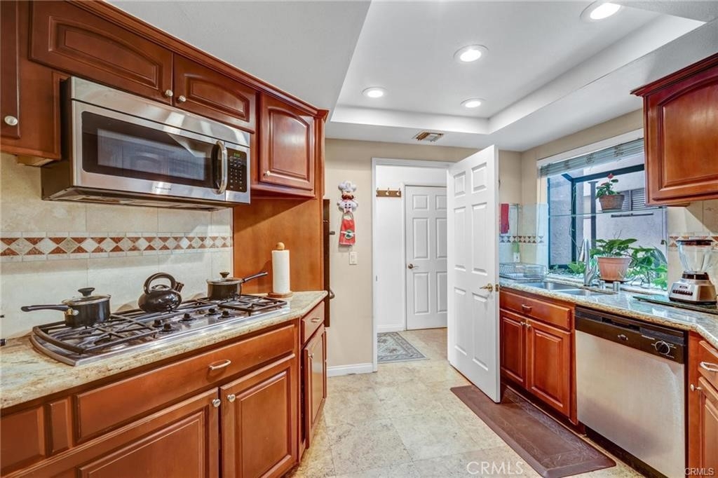 B.O.M. Back On Market. A rare townhome in Chandler Estate area - feels like a house! This spacious townhome boasts 3 bedrooms + Den / Sitting Area + Formal dining room+ a very large roof top deck + a private enclosed garage w/direct access to unit. .The living room has soaring high ceiling, genuine hardwood floors, fireplace, multiple flower-balconies. It opens to a Formal Dining Room and to a Den / Sitting room. The kitchen opens to the sitting area and to the formal dining room and flawlessly to the Living room. Upstairs you’ll find an en-suite super large primary bedroom with a 2nd fireplace, 2 walk-in closets another flower balcony w/views of tree tops. The primary bathroom has skylight, double sinks and a spa-tub. The huge private rooftop deck is a real treat: relax on this spacious rooftop deck and enjoy the views of tree tops and the hills beyond. The secured private garage has direct access to home & laundry! Location is superb: close to Fashion Square and to Sherman Oaks Galleria – perfect for dining, entertainment, health clubs… We're across the popular jogging stretch along Chandler Blvd. You’ve got it all: an amazing townhome located in an incredibly convenient location! Rarely found in such a central area of Sherman Oaks.