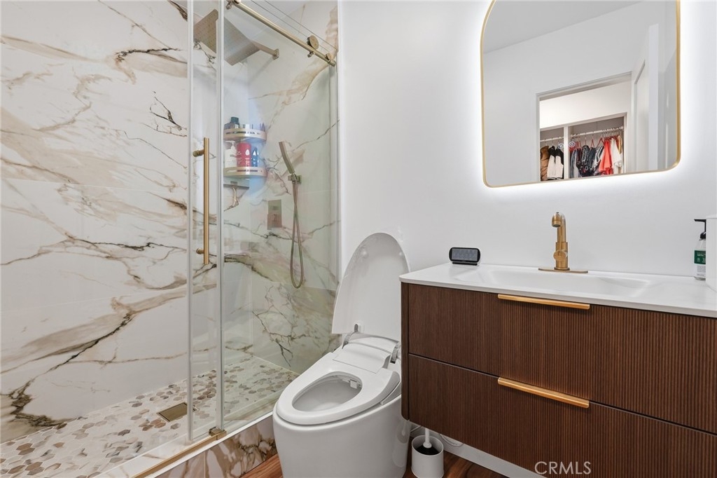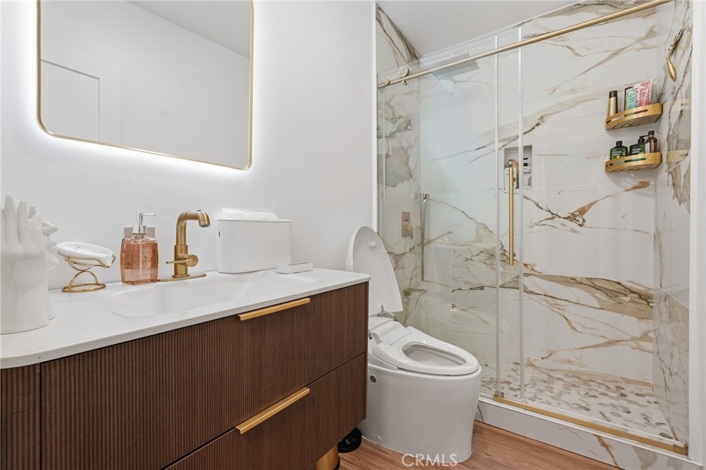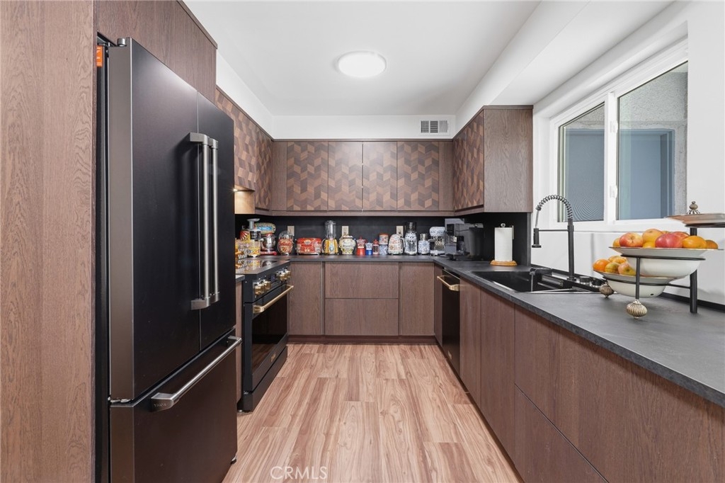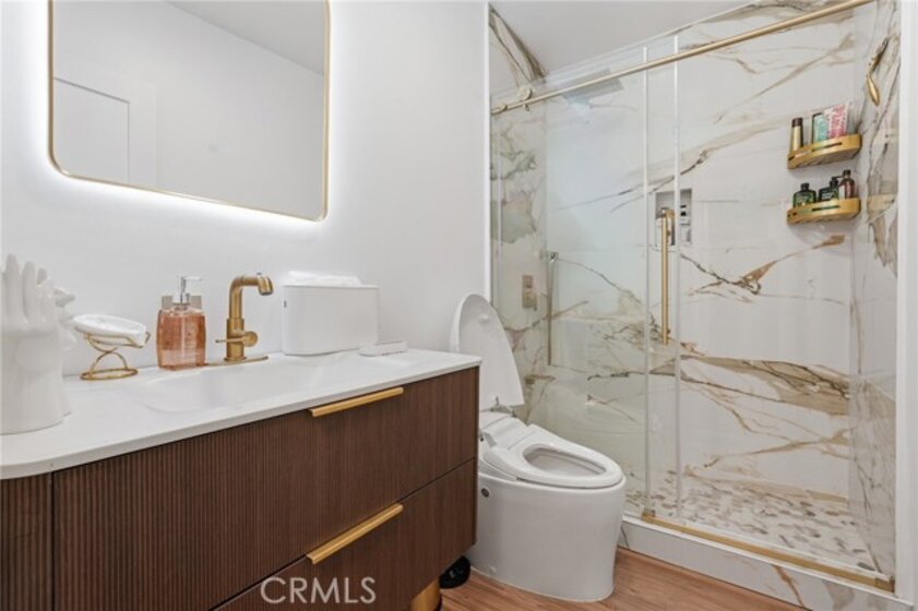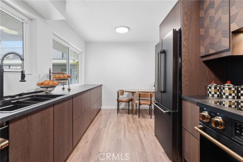 Ultra-modern 2-bedroom, 2-bath condo offering 1,052 sq ft with first-floor entry and a private patio. The bright, open interior features new flooring, recessed lighting, and abundant natural light throughout. The sleek, modern kitchen is equipped with top-of-the-line appliances, a ceramic cooktop, wall oven, and ample cabinetry. The spacious primary suite includes a massive walk-in closet and generous storage. Both bathrooms have been luxuriously upgraded with high-end finishes, including bidet features. In a well maintained building offering community laundry, secure intercom access, and one assigned parking space in a gated subterranean garage. Residents also enjoy a sparkling community pool. Ideally located near shopping, dining, parks, and freeway access, this home offers a perfect blend of modern design, comfort, and convenience.