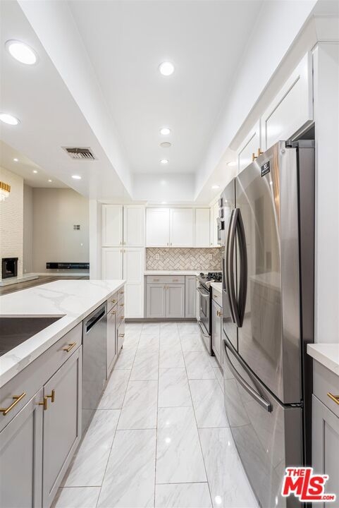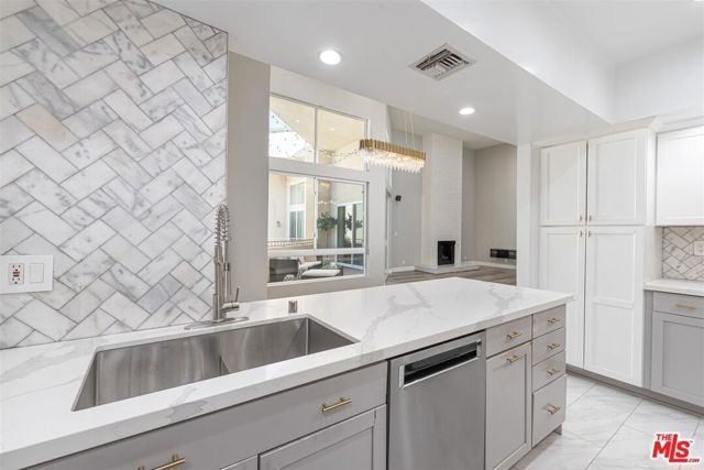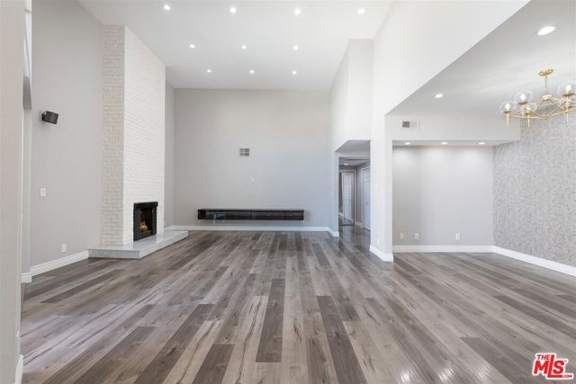 Welcome to one of the most sought-after top-floor, high-ceiling units in prime Sherman Oaks, south of the blvd! This beautifully updated condo blends modern comfort with timeless style. Flooded with natural light, it features dramatic high ceilings, wide-plank flooring, dual-pane windows, and an open-concept layout that feels spacious and airy. The living room centers around a sleek white brick fireplace and opens to a large private balcony with pool views perfect for relaxing or entertaining. A bonus space off the living room offers exceptional versatility, ideal for a home office, cozy den, or third bedroom. The large balcony provides plenty of space for outdoor dining and lounging. The updated kitchen offers quartz waterfall countertops, herringbone backsplash, stainless steel appliances, and ample cabinetry. Both bedrooms have refreshed ensuite baths and direct balcony access, with the primary suite featuring a walk-in closet. Additional highlights include in-unit side-by-side laundry, EV charging, BBQ hookup and updated finishes. The community offers a pool, spa, and moments from restaurants, cafes, shops, and transit.
