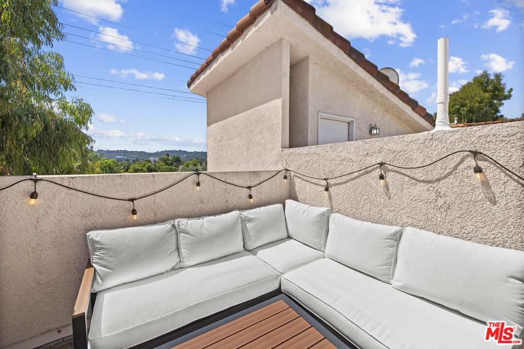 Light, bright end-unit in the heart of Sherman Oaks with furnishings included! This 2 bedroom, 2.5 bathroom condominium offers an excellent central location in a gated complex with very low HOA fees. Accessed directly from outside, the corner unit features a gated entry-level wraparound patio enclosed in mature landscaping. Inside, the living room is flooded with natural light through arched windows and features a gas fireplace, wet bar, and mounted TV. The dining area is located next to sliding glass doors with patio access and flows into a well-equipped kitchen. There are two-bedroom suites upstairs with wood floors, and the primary bedroom features a vaulted ceiling, two closets, built-ins, and a private balcony. On the upper level, the property offers a laundry area with a side-by-side washer and dryer plus access to a private rooftop deck with tree-top and mountain views perfect for enjoying picturesque sunsets in the Valley. Additional features include central heating and A/C, an entry-level powder room, a deep outdoor storage closet, and two side-by-side parking spaces in the gated garage. The low monthly HOA includes water, trash, sewer, and maintenance of common areas. Enjoy excellent proximity to highly rated schools, Sherman Oaks Recreation Center, Sportsmen's Lodge, an electric vehicle charging station just down the road, and convenient access to both the 101 and 405 freeways. This one won't last long!