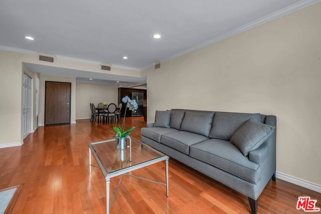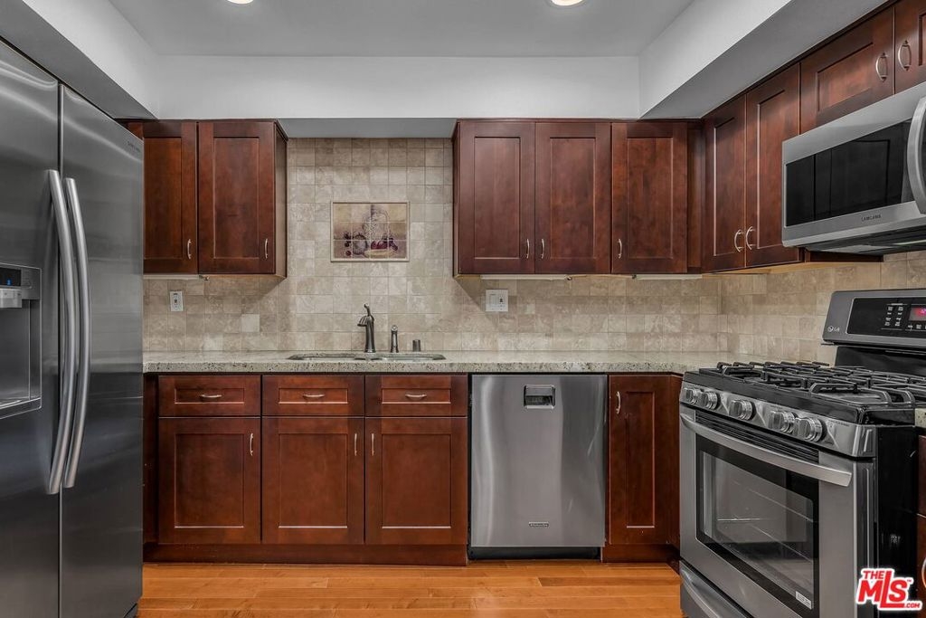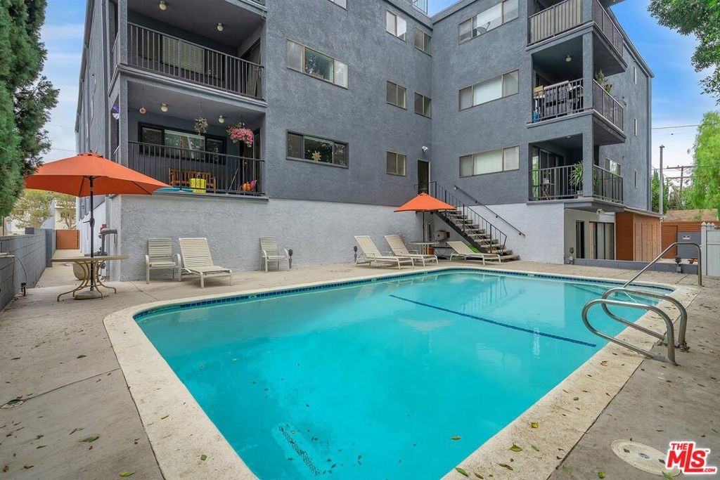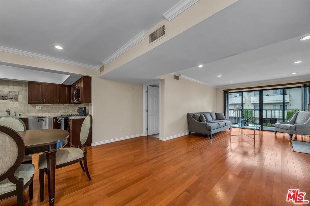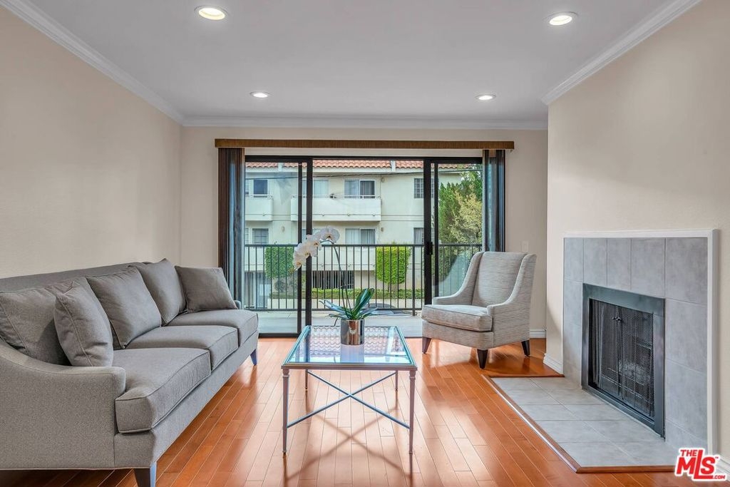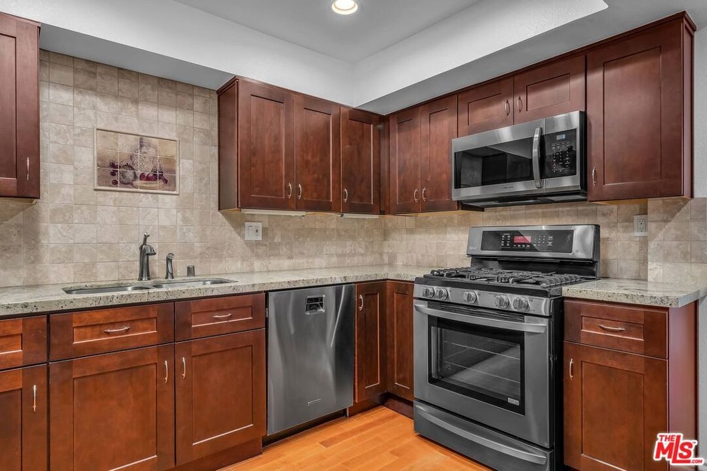 Meticulously maintained 1st floor unit in a desirable residential Sherman Oaks neighborhood. The unit boasts an open floor plan with kitchen, dining and living room with glass doors leading out to a large covered patio facing the side street. There are wood floors, smooth ceilings with recessed lighting and a fireplace. Kitchen with stainless steel appliances, beautiful stone backsplash, and granite counter tops. The particularly large primary bedroom suite has a remodeled bath with a oversized stone shower with bench. There is a dressing area that leads into a huge walk in closet.Separated 2nd bedroom is spacious and has its own bath. Inside laundry. Small well maintained building with 15 units and pool. Enjoy this comfortable and spacious unit close to shops and restaurants. Trust sale no court confirmation.