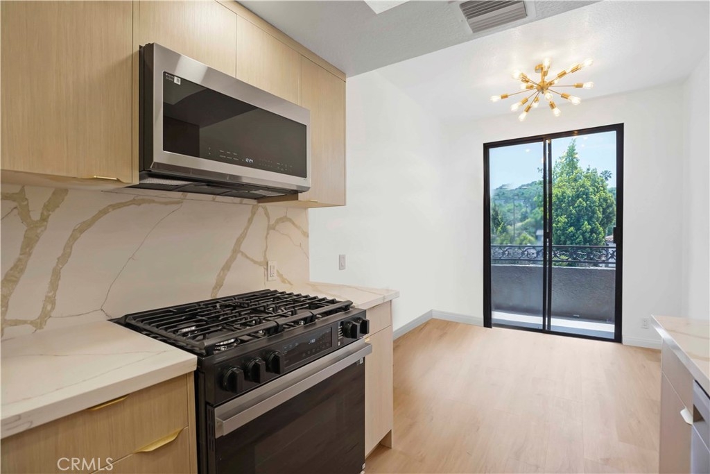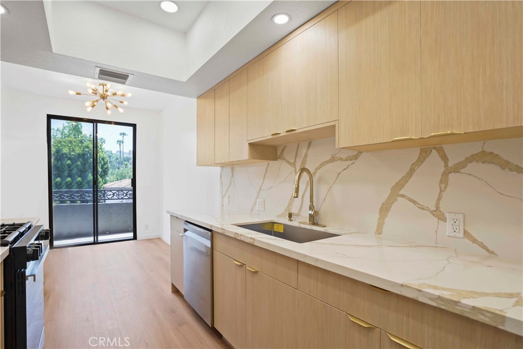 Welcome to this stunningly renovated penthouse nestled in one of the most prestigious neighborhoods in Sherman Oaks. Flooded with natural light, this luxurious residence features soaring 15-foot ceilings and expansive windows that frame sweeping views and create an airy, open ambiance. The thoughtfully designed open floor plan includes a stylish living room with a fireplace, an elegant dining area, and exquisite wide-plank flooring throughout. The chef’s gourmet kitchen is a culinary masterpiece, boasting custom European cabinetry, stainless steel appliances, and a cozy breakfast nook—perfect for both entertaining and everyday living. A separate laundry room adds to the convenience. The oversized primary suite offers a serene retreat with generous space, breathtaking views, and a refined sense of privacy. The en-suite bathroom is beautifully appointed with dual vanities, a soaking tub, and a separate shower. Residents of this secure, well-maintained building enjoy access to an array of upscale amenities including a pool, spa, sauna, fitness center, and ample guest parking. HOA dues cover water, cable, earthquake and liability insurance, grounds maintenance, landscaping, and upkeep of the pool and spa. Situated just moments from premier shopping, dining, and with easy access to the Westside, this penthouse exemplifies true pride of ownership and sophisticated urban living.