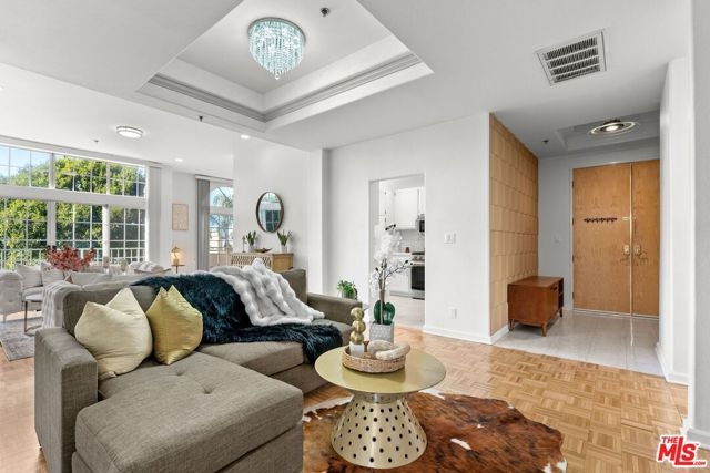 Move-in ready West-facing penthouse spanning the entire front of the building with sweeping sunset views and three private balconies, including a wraparound balcony off the dining area. This top-floor home features 10' ceilings, floor-to-ceiling windows and an open living, dining and den layout filled with natural light. The remodeled kitchen includes quartz counters, stainless-steel appliances and a pantry with pull-out drawers. The primary suite offers two closets (including a walk-in) and a spa-like bath with dual sinks, a soaking tub and a separate shower. The generous second en-suite bedroom overlooks the Sherman Oaks hills. Additional features include parquet wood floors, in-unit laundry, a guest powder room, excellent storage and a newer HVAC system. Two tandem parking spaces included. The secure building offers three guest parking spaces, and HOA dues include water and earthquake insurance. Prime Sherman Oaks location moments from Ventura Boulevard, great restaurants, Ralphs, Fashion Square and quick access to the 101/405 and nearby canyon routes.